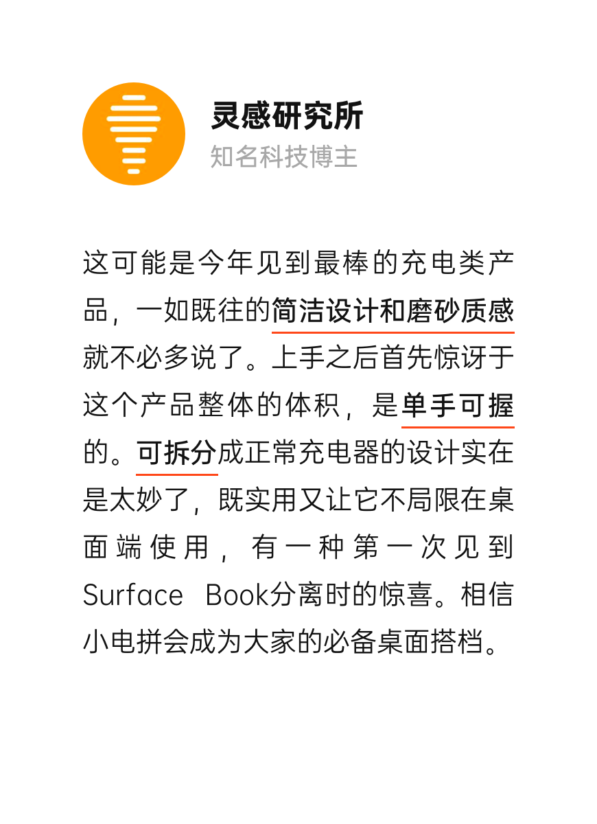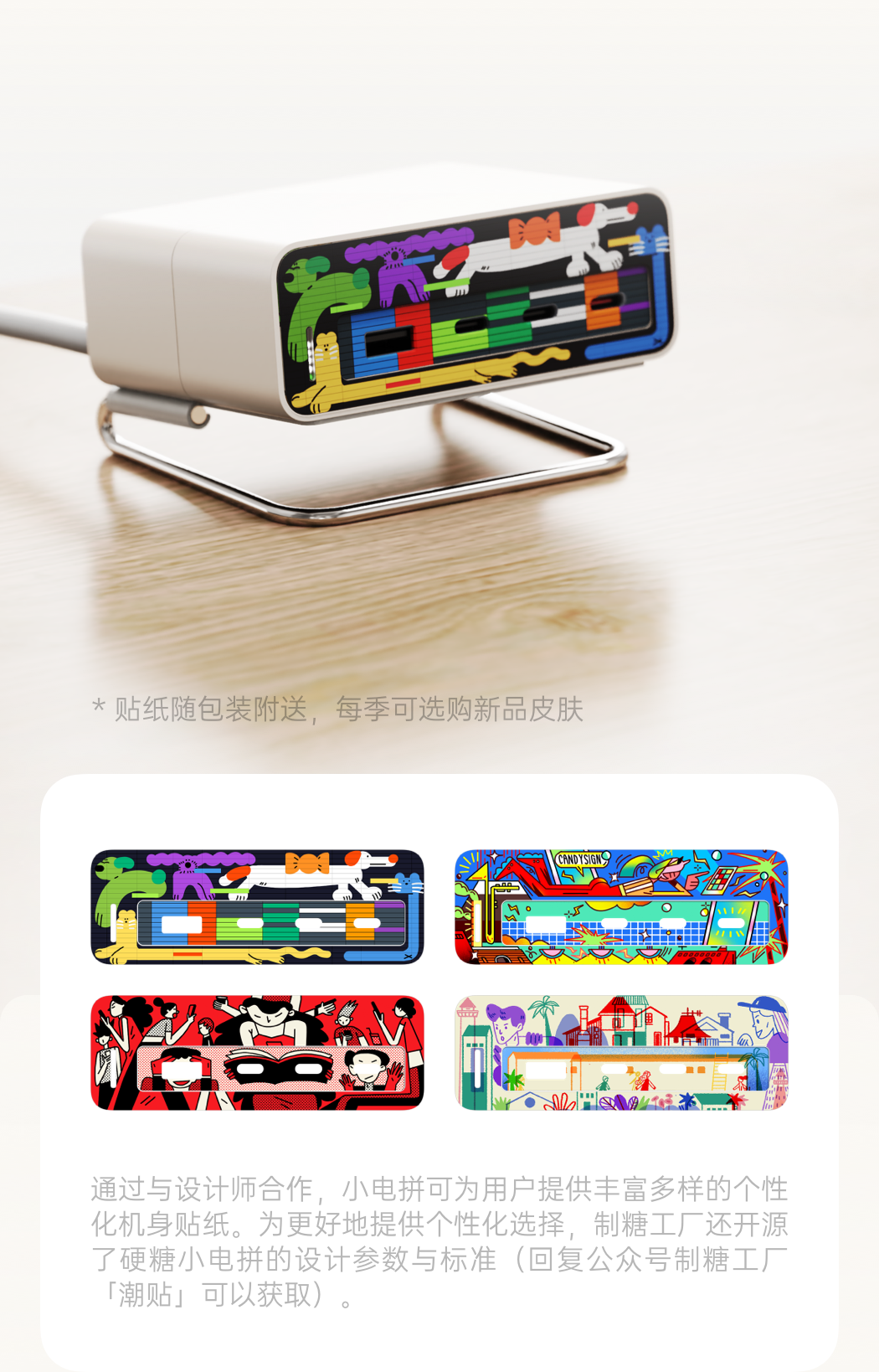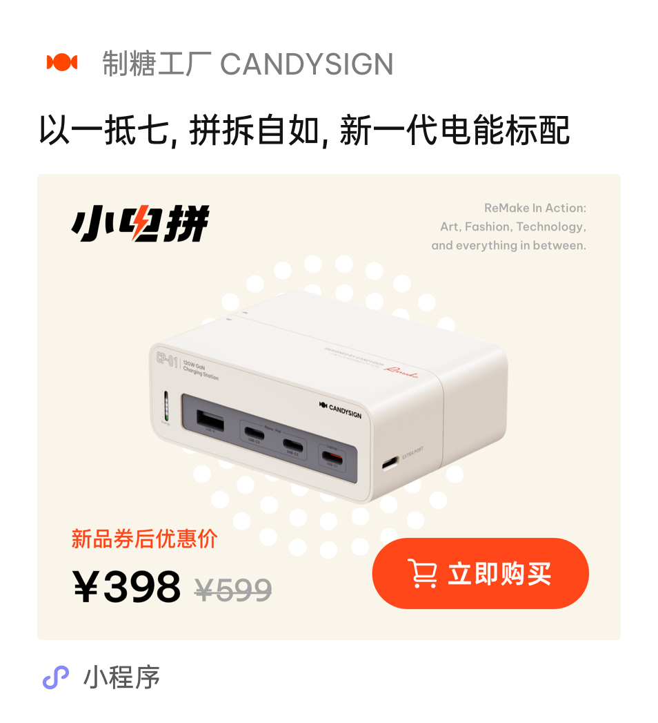 「小电拼」是制糖工厂出品的新一代电能标配,也是一个原创的全天候桌电系统,它集随行充和桌电坞于一身,体积小巧且充满设计感——在家,它是时尚漂亮的「全能桌电」;出行,秒变小巧灵便的「随行潮充」。