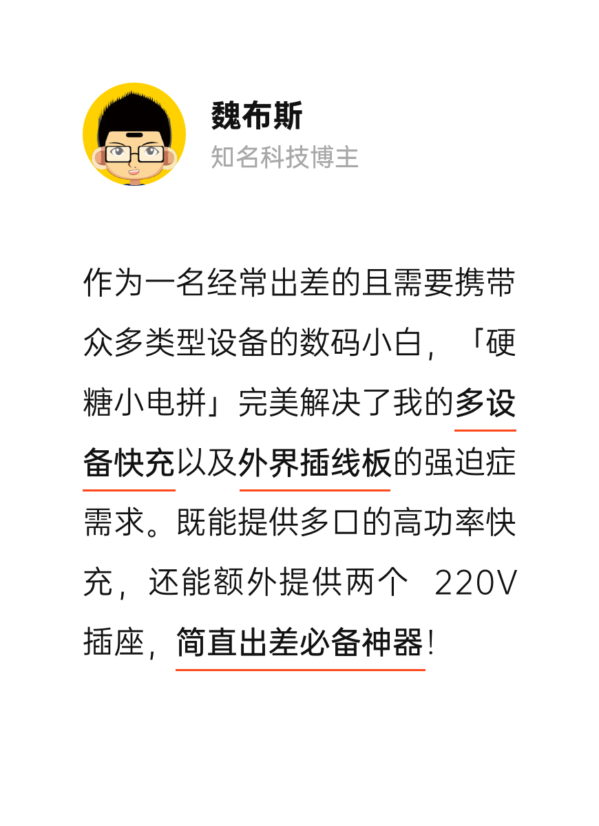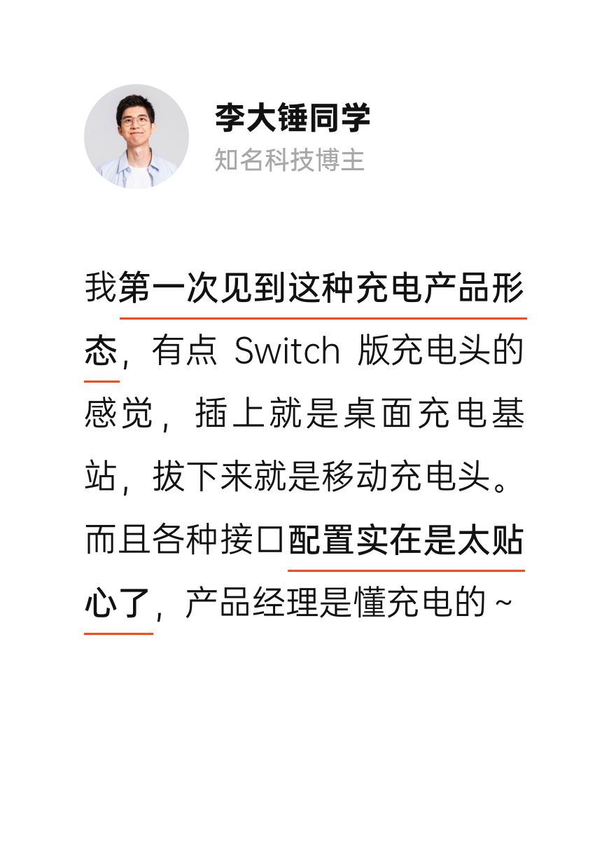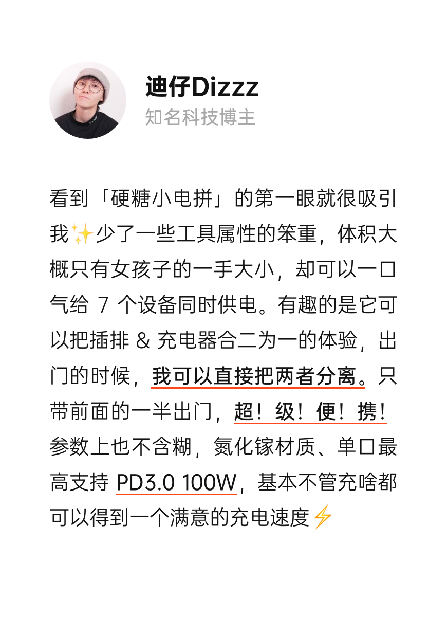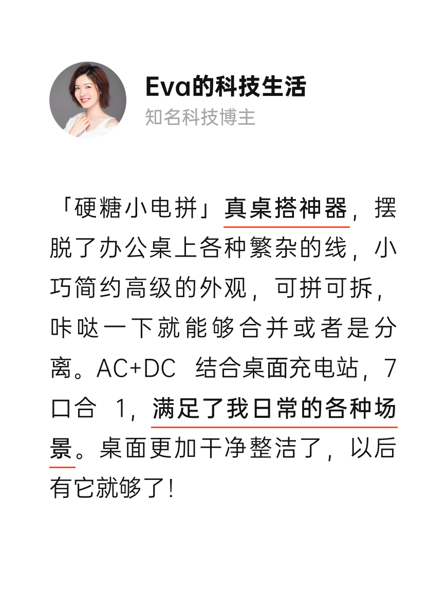 「小电拼」是制糖工厂出品的新一代电能标配,也是一个原创的全天候桌电系统,它集随行充和桌电坞于一身,体积小巧且充满设计感——在家,它是时尚漂亮的「全能桌电」;出行,秒变小巧灵便的「随行潮充」。