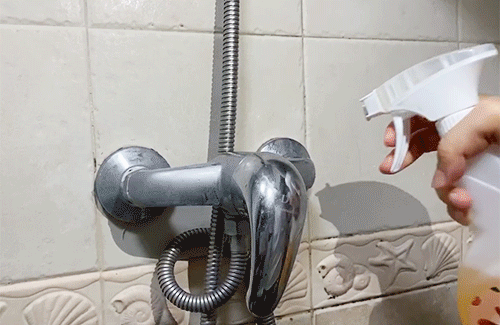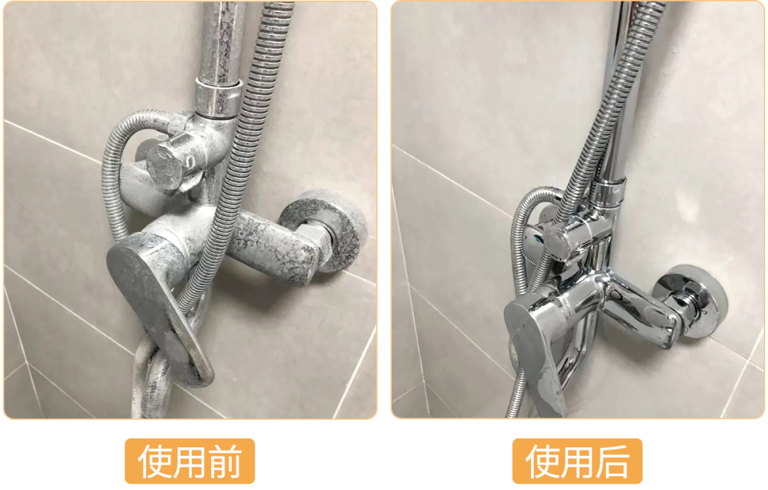 喷上后等一两分钟,用抹布轻轻一擦,水龙头上烦人的水垢也立马乖乖消失。(通常都是把整个浴室先喷一遍,擦的时候就不用等啦~)