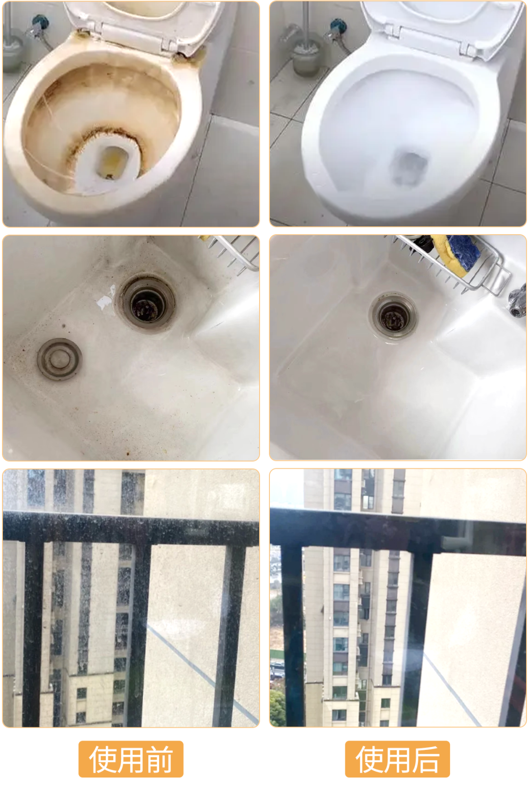 还有能对付瓷砖缝隙、马桶发黄尿渍的表面活性剂和环保溶剂。