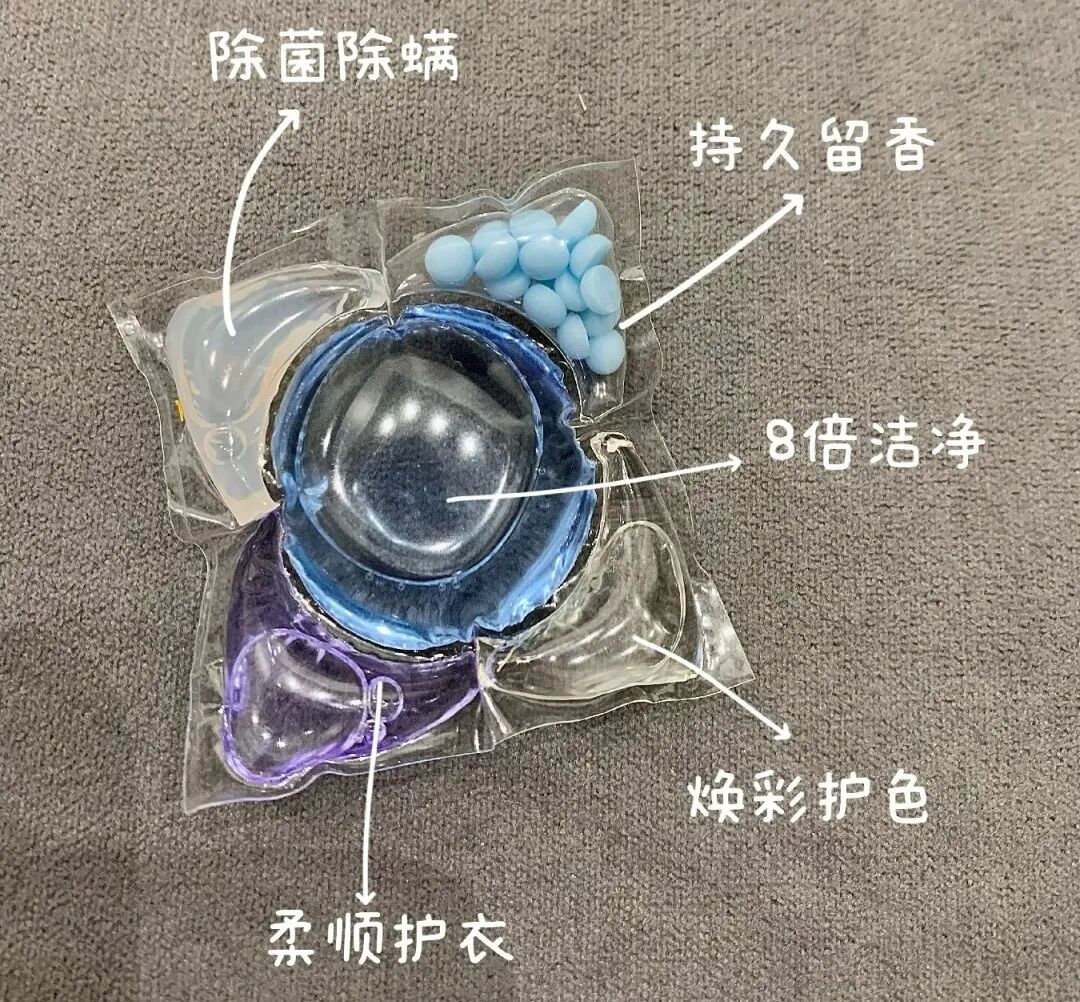 洗衣凝珠刚开始只有清洁用的单腔,后来不能满足我们留香,杀菌、柔顺的需求,逐渐更新升级!
