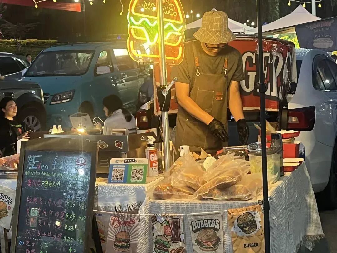 也有摊主在体验市集后,主动降低了对市集的期待。从今年3月份和老公一起开始筹备“路边汉堡”项目的Eden,先后尝试在大学城、商圈以及主题市集摆摊,她告诉惊蛰研究所,对于餐饮项目而言,参与市集对提升营收的效果比较有限。今年端午节期间,Eden参加了位于汉口江滩的后备箱市集,摆摊的三天时间里,日均营业额在1000元左右。“前两天的收入还不错,但是第三天因为是假期的最后一天,本地顾客不出门了,外地游客回家了,所以收入基本上是大跳水。”在Eden看来,餐饮门类本身会重视回头客的转化,而市集通常是在周末或节假日举行,而且有很多顾客都是临时来参加市集,两三天的时间根本上无法达到积累长期客户的目的,长期跟随市集流动摆摊也意味着无法产生转化。“对于没有固定场所的流动汉堡摊主来说很难对顾客产生吸引力,无论是大学城还是哪里的商铺,在拥有固定门店以后,或许更适合抱着推广的心态去参加市集。”受访者供图