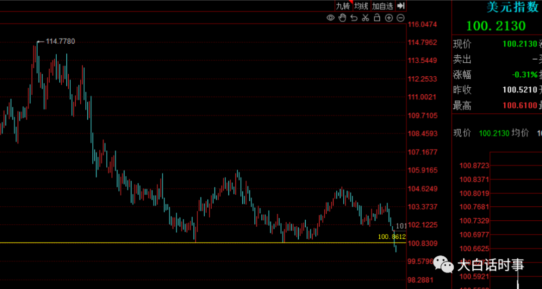 受市场对下半年美联储加息2次降温的影响,美元指数也出现单日1%的大跌,一口气跌破了101的关键点位。