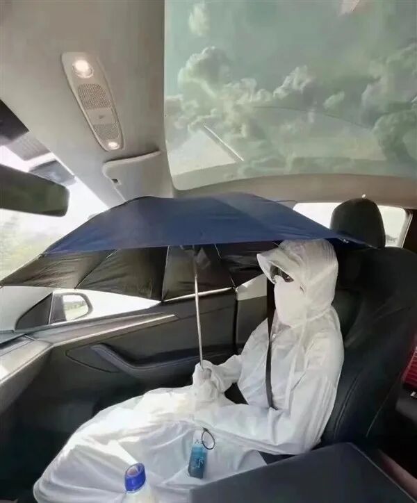 最近的天气是真的热啊!北京气温已经逼近 40 ℃,人在北京的同事,甚至表示要去吐鲁番避暑。尤其是那些弄了全景天幕的新能源车,车内温度随随便便就能到 60 多度。要是没办法遥控车子开空调,那就只能像这样给车扇扇风了。或许是因为主动散热太累,有人研究起了被动散热的小技巧。但这个改装最大的 Debuff 嘛,应该就是吸引交警叔叔了。毕竟改装外部车顶属于违法行为。当然,也可以打开思路。以降温防晒作为中心思想,把车内优化当作主要手段,很容易就能收获更多效果显著、成本低廉、创意爆炸的。。。乐子。比如这位女士,身披防晒服、高举遮阳伞,墨镜面罩也全都安排上,达成全身 360 度无死角防护。还有这位 “ 老农 ” ,头戴斗笠,手持蒲扇,一时分不清他究竟是在田里还是在车里。更有手工达人,直接张贴 “ 车顶日报 ” ,旧报纸二次利用,突出一个该省省该花花。要是觉得上面的方法不够优雅,那将预算再拔高一点点,就可以网购到一些相对正经的遮阳产品。某宝上搜索 “ 汽车天幕遮阳 ” ,就可以发现这类产品的销量相当可观。就现在车企推广全景天幕的力度,这个市场绝对还处在蓝海阶段。只差启动资金 1000 万,我们就能立刻上架 “ 差评太阳伞车内专用版 ” 。不过话说回来,别看现在全景天幕是人人喊打,但在燃油车时代,那是妥妥的高配象征,老牛 X 了。第一款配备天幕的车型是 1941 年生产的林肯欧陆 Derham Coupe 。当时为了缓解这种双门跑车内部采光不足的压抑感,设计师灵机一动,用一块透明材质车顶替换了之前的金属车顶。类似的还有 911 Targa ,不仅车顶敞篷,还用一整块圆弧玻璃取代了 C 、 D 柱的结构,成为一代设计经典。我还记得第一次坐进 MINI 的时候, MINI 的全景天幕低配版——前后排双天窗,就很通透、高级。但是!像 MINI 这样的家用车,基本都是配备了遮阳帘的。原因很简单,纯电车型的垂直空间比燃油车更拥挤,容不下遮阳帘。纯电车在底盘上铺设的电池,会对车厢垂直空间造成很大的侵占。相应的,为了把下面丢掉的空间找回来,车企们通常会拆东墙补西墙,从车顶上动手。如果把传统金属软包车顶换成玻璃天幕,不仅能小幅度改善乘员的实际头部空间( 大概省 3 - 5 cm ),还能大幅改善乘员的心理头部空间。通俗讲,就是给乘客一种不顶头的错觉。例如蔚来 ET5 ,轿跑造型大溜背,很厚的地台,加上高坐姿,玻璃天幕就成了头部空间的唯一解药。而如果像燃油车那样给全景天幕配上电动遮阳帘,布帘加上导轨,反而又会占据 3 - 5 cm 的垂直空间,一来一回约等于没有优化。所以啊,通常在一部分不太在意车高的 SUV,例如蔚来 ES6 和大众 ID.6 上,遮阳帘这个配置才比较常见。其实车企们也想过其他的替代方案。例如极氪 001 上用到的 EC 光感天幕玻璃,可以根据阳光的强弱而改变颜色。其原理是通过对玻璃施加电压,让电子与三氧化钨材料发生化学反应,变成较深的蓝色,波音 787 客机的舷窗上就用了这个。极氪官方宣称:“ EC 光感天幕紫外线阻隔率高达 99.9 % , SPF 防晒系数可达到 50 ,同时还具有低热辐射和透明度低的特性,防晒、隔热、隐私性面面俱到。 ” 但根据一部分极氪 001 车主的反馈,这玩意儿防晒还行,隔热真一般。问题出在了哪里?初中物理课本就说过,挡光并不等于隔热。EC 天幕通过变深颜色降低了阳光对车内的热辐射,但能量守恒,这部分热量不会凭空消失,而是几乎被天幕玻璃吸收了。加热的天幕玻璃会慢慢地通过热传导向周围的空气传递热量,一大部分热量还是会被传递到车内。而且,阳光中 52 % 的热量来自红外线、45 % 来自可见光,紫外线只占 3 % 。阻隔紫外线确实是能防晒,但这并不意味着它能很好地隔热降温,最多就证明乘客在车里不会晒黑。简单来说,通过改变玻璃透光度的方式,的确能防晒,但隔热效果属实不咋地。至于普通的车顶,即便是黑色的,车顶和座舱之间也有个夹层,可以有效隔绝热量。还是得靠遮阳帘。帘子毕竟是一个实体,和车顶天幕玻璃之间留下的空隙,会形成一个小小的密闭空间。大部分热量会被隔绝在这个密闭空间里,这样车舱就能保持阴凉。但这玩意还是不能尽善尽美。非原厂的遮阳帘一是颜值不够高,二是拆装不太方便,部分带电动的还需要改动顶棚结构,存在一定的安全隐患。这里给备受天幕 “ 光明顶 ” 困扰的各位车主一些改造建议:侧重颜值就贴张 pdlc 光感变色膜( 好看但不隔热 );侧重隔热效果就加个网布遮阳帘( 隔热但不好看 );又要颜值又要隔热,建议买有原厂电动遮阳帘的车。但说到底,这些方法终归是亡羊补牢。脖子哥还是希望车企们从问题的根源上想办法,降低电池的厚度,让所有全景天幕都能拥有自己的遮阳帘。又见车内打伞特斯拉、蔚来均中招:为何就是不配遮阳帘?戴草帽的特斯拉车主带火一个品类!不少商家单品月销超 10 万件