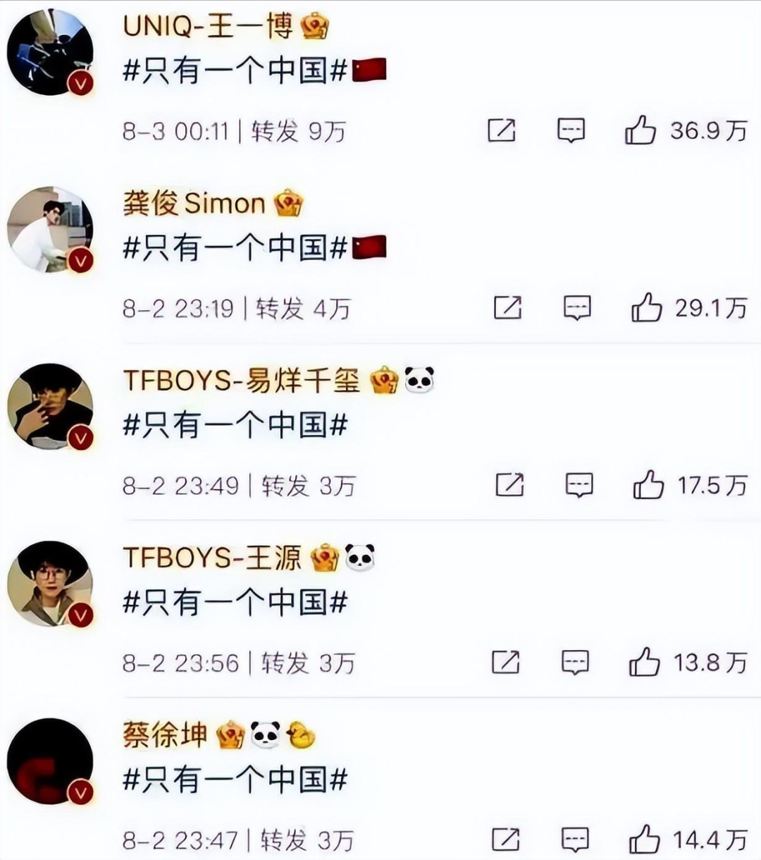 央视新闻在社交平台上直接发布了“只有一个中国”的话题,明眼人都明白,很多公众人物都主动转发了这条动态,以此表示自己的坚定立场。