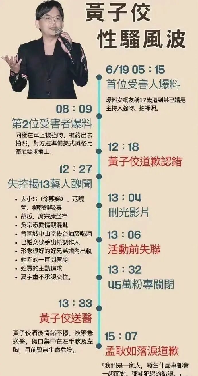开局一个黄子佼,一连牵扯出来十几位大牌明星艺人,包括但不限于,大S、小S、阿雅、范晓萱、炎亚纶、黑人陈建州等等。