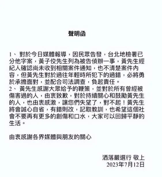 黄子佼发文称自己尚未收到案件通知,但在文中表示会承担年轻时犯下的过错,全力配合司法调查。并且向被伤害过的人由衷道歉,感谢关心和鼓励他的人,也希望社会不要再有更多的创伤和口水。