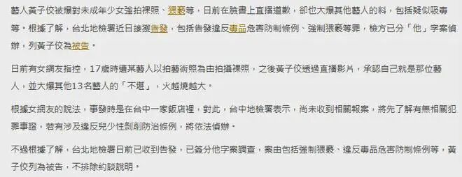刚就有弯弯媒体报道称,岛内民众日前向台北地检署告发黄子佼涉嫌强制猥亵,及违反“毒品危害防制条例”、“儿童少年性剥削防制条例”等罪,台北地检署12日证实已分“他字案”,将黄子佼列为被告侦办。