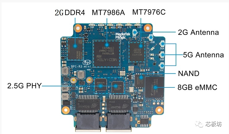和R3一样的联发科MT7986(Filogic830,四核Cortex-A53 2.0GHz),2G内存,8GB eMMC Flash,128MB Nand Flash,板载Wi-Fi 6芯片。