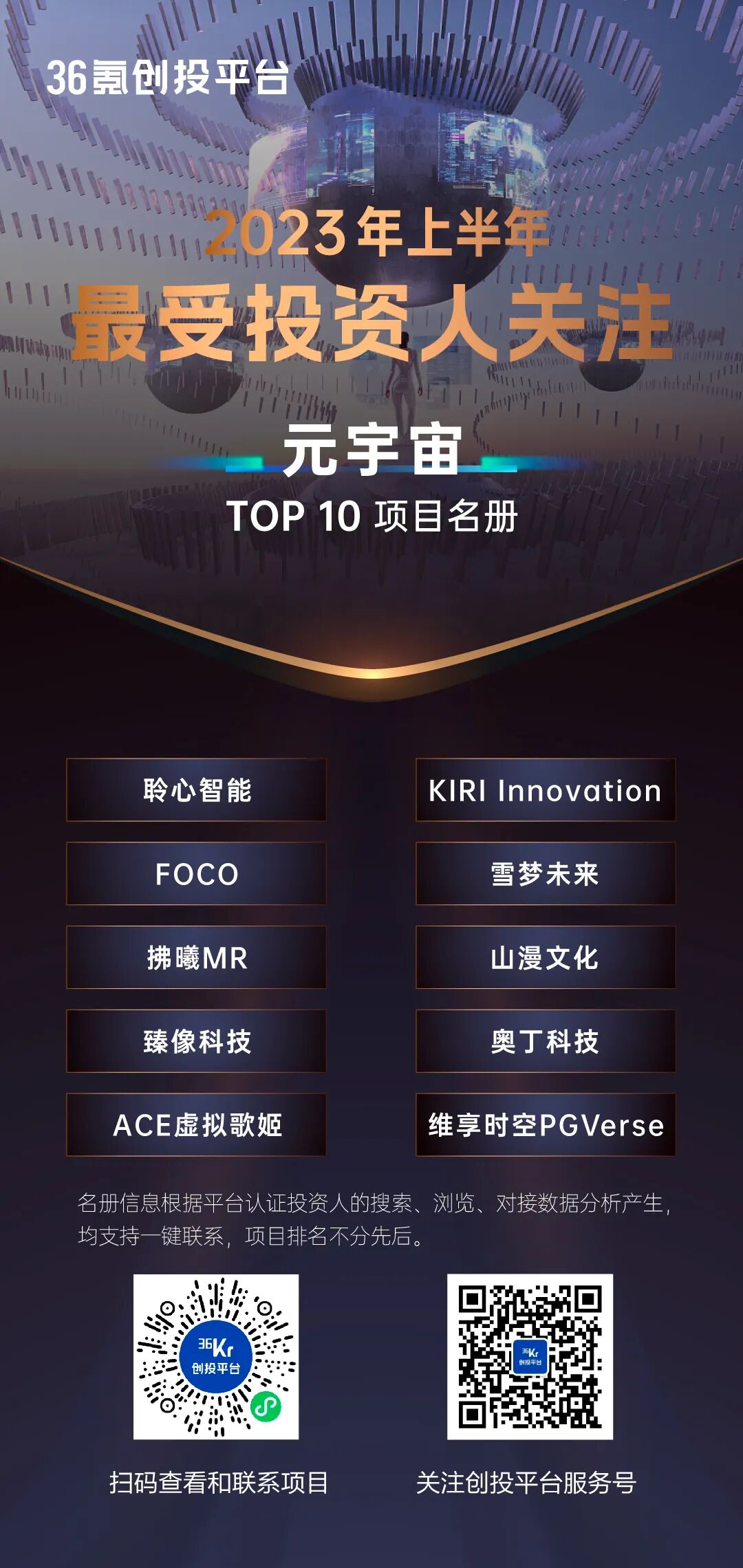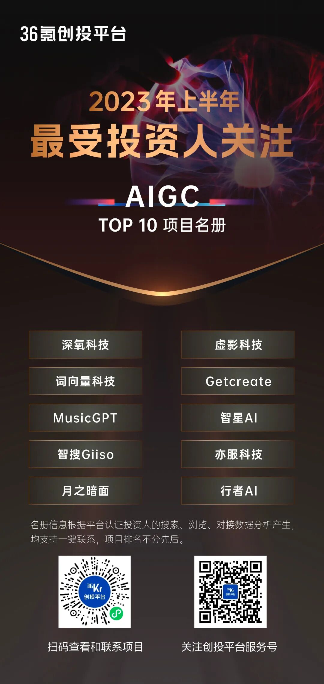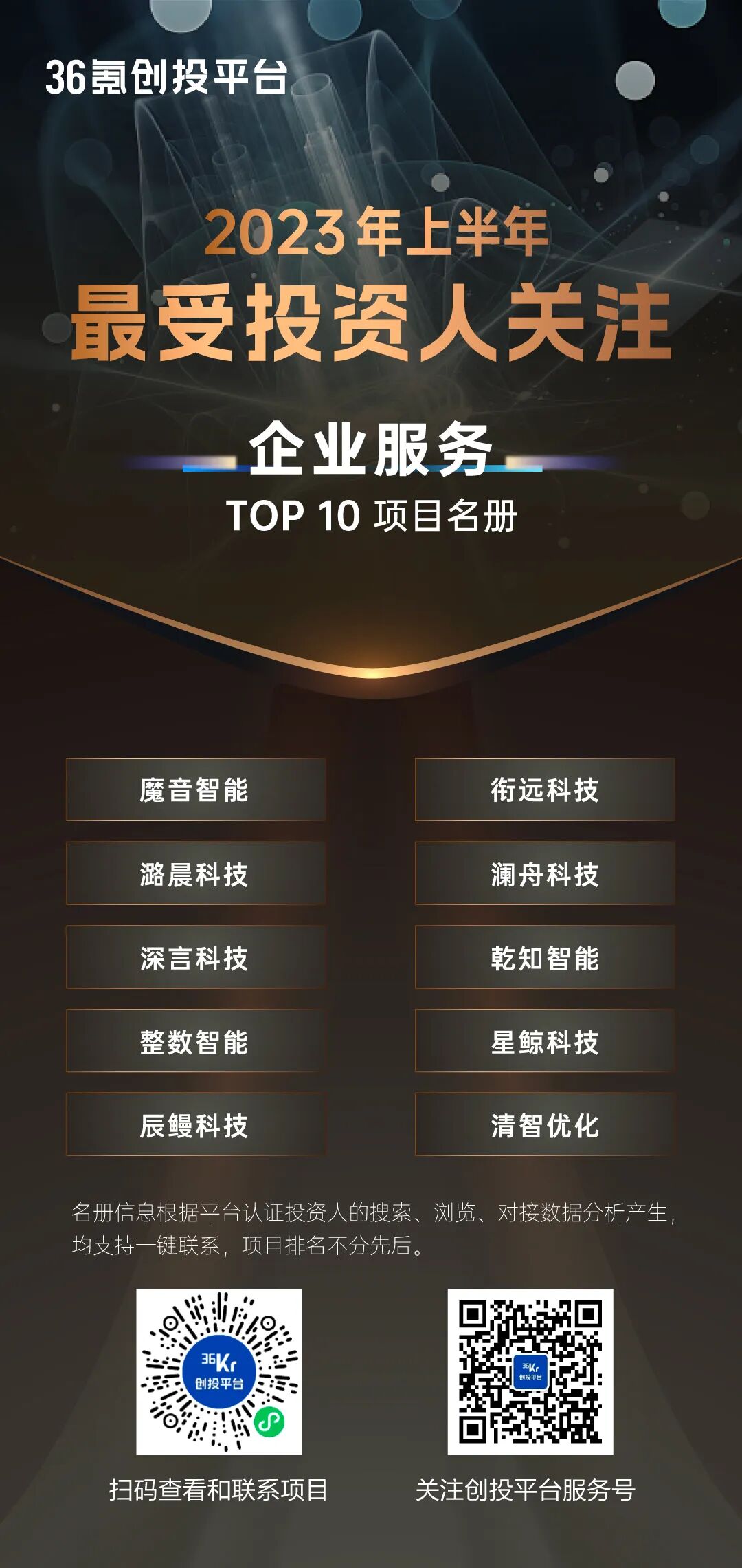 【特别提示】36氪创投平台将以上项目名册,以合集形式收录至“36氪创投平台”,可点击海报或扫描海报上的小程序码查看每一家企业的详细情况,如对企业感兴趣可点击「联系」直接发起对接。36氪创投平台集合强势媒体力量、数据挖掘研究能力和专业服务能力,深度链接中国创新创业生态,致力于成为中国新经济生态参与者首选的连接平台。自上线以来,平台已入驻超过20万+优质企业,3千多家一线机构的活跃投资人,近半年有超过10000家企业在平台上获得了资本关注和后期融资动作推进,同时即将上线企业融通创新平台,帮助中小型创新科技企业与产业链中的大企业融通连接,共谋发展。可通过36氪官方网站、36氪App、「36氪创投平台」官方小程序,查看创投市场最新资讯,查看各领域优质项目,认证机构投资人更可体验一键速联。业务咨询合作,请邮件联系:
