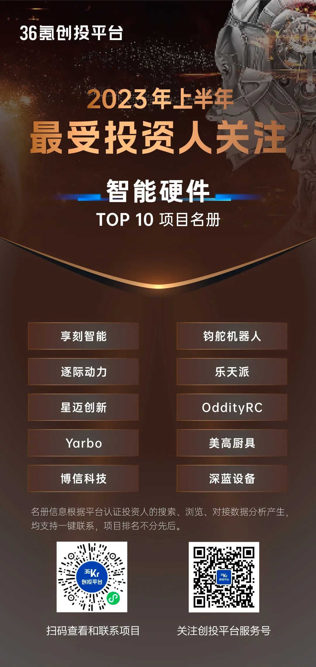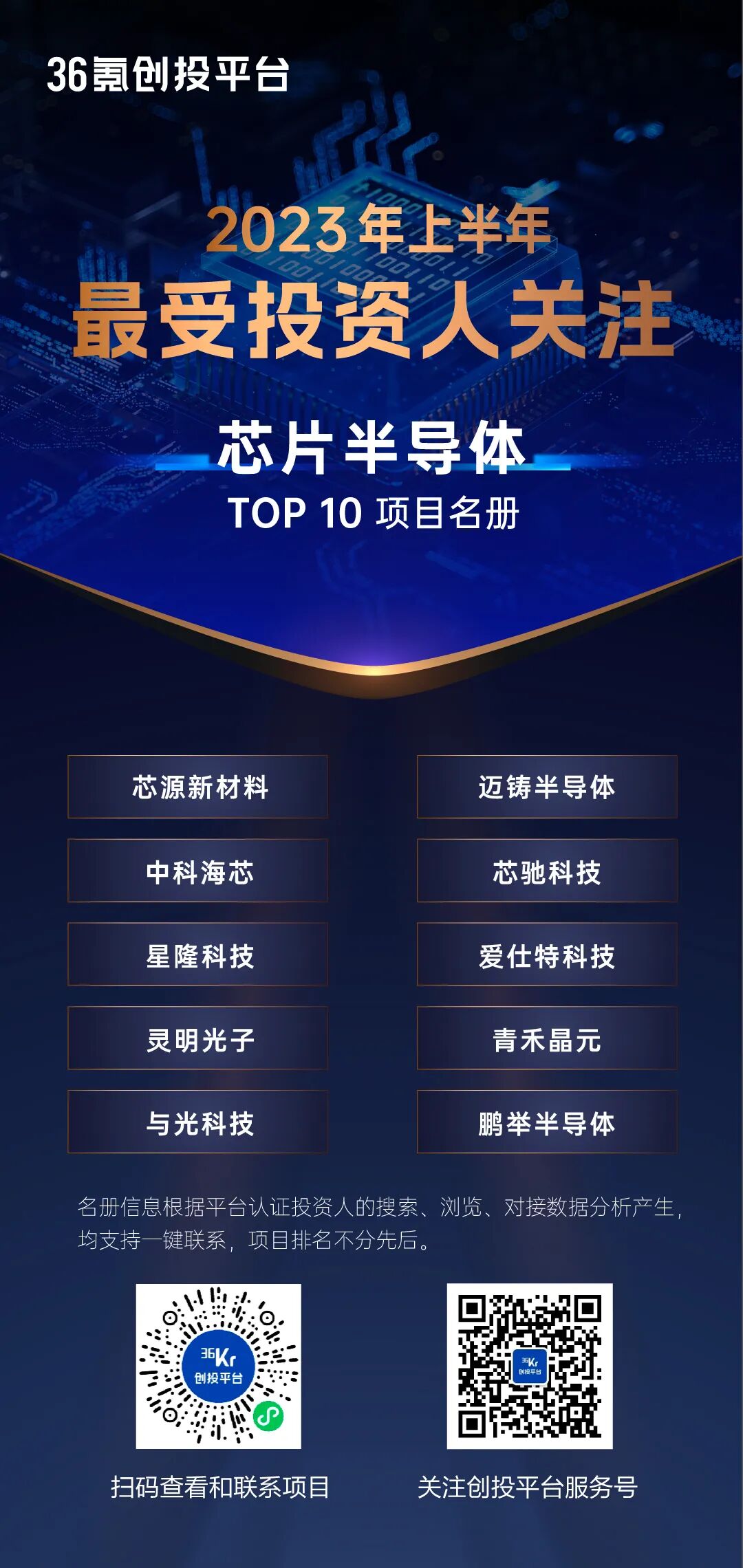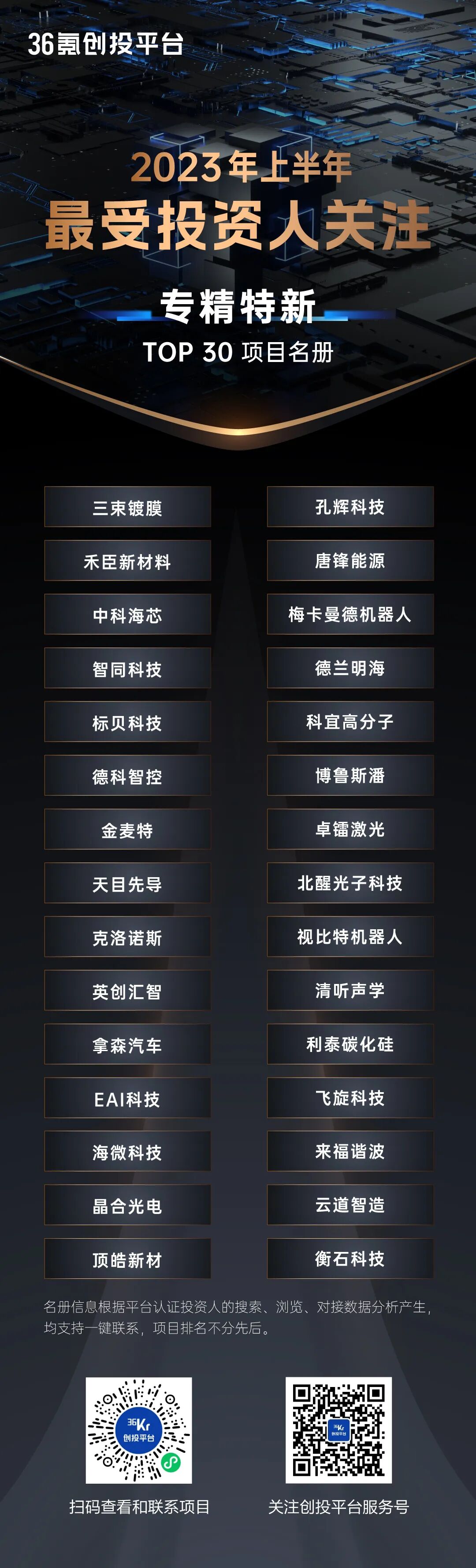 创投市场经历了几年的连续低沉和逻辑转换,模式创新项目生存空间越来越少,产业技术创新却持续加速向前。2023年已经过半,上半年投资机构最关注的赛道是什么?哪些企业是投资人最关注的标的?如何从海量项目中发现优质投资机会?为进一步消弭创投双端信息差,为市场提供新的观察视角,36氪创投平台根据3000余家认证机构一线投资人的偏好和对接情况,推出半年度「最受投资人关注项目」合集,共包含十余个新兴赛道的130家公司。据36氪创投平台数据显示,上半年平台内共产生项目相关的访问近千万次,成功通过平台与投资机构建立联系的企业达数万家,得益于优质企业的不断挖掘收录和曝光推介,在市场下行的情况下,创投平台内的各项搜索和对接频次仍保持显著增长。从赛道分布剖析投资人的关注要点,先进制造以绝对优势在数量、质量和频次上都拔得头筹;随着ChatGPT的突破性进展和持续火热,大模型、AIGC等相关方向的本土创业企业也异军突起,成为上半年的绝对热点;前沿技术、医疗健康、能源环保、企业服务等近年热门以及国产替代方向的芯片半导体、智能硬件等,依旧被投资机构重点关注。此外,随着股权投资的国资时代正式开启,区域产业发展诉求的进一步增强,“专精特新”企业作为中国智造和产业升级的重要支撑,也获得了资本的显著青睐。平台上半年被对接的企业中,有17%是已被认定的专精特新中小或小巨人企业,不仅占比很高,也呈现了非常迅猛的增长态势,预计下半年趋势将进一步放大。综上,根据36氪创投平台的数据,通过对2023上半年以来平台认证机构投资人的搜索、浏览、对接等大数据综合计算评选,同时兼顾企业的开放意愿和对接接受度,36氪创投平台重磅发布「2023上半年最受关注-专精特新TOP30」、「2023上半年最受关注-十大领域TOP10」独家项目名册,从上半年的市场动态,预见未来市场风向,共同关注最受投资人青睐的热门领域创业项目。