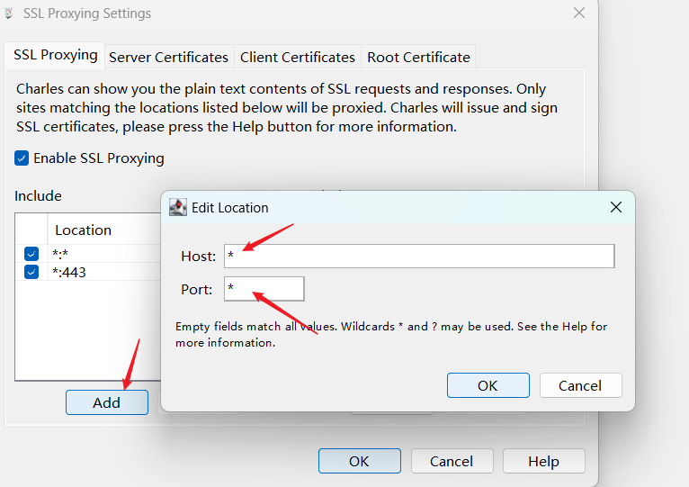 因为后续需要把数据包转发到burpsuite,便于数据包在burpsuite上的更改,所以我们的burpsuite还需要导入charles的证书,在Help-->SSL Proxying下