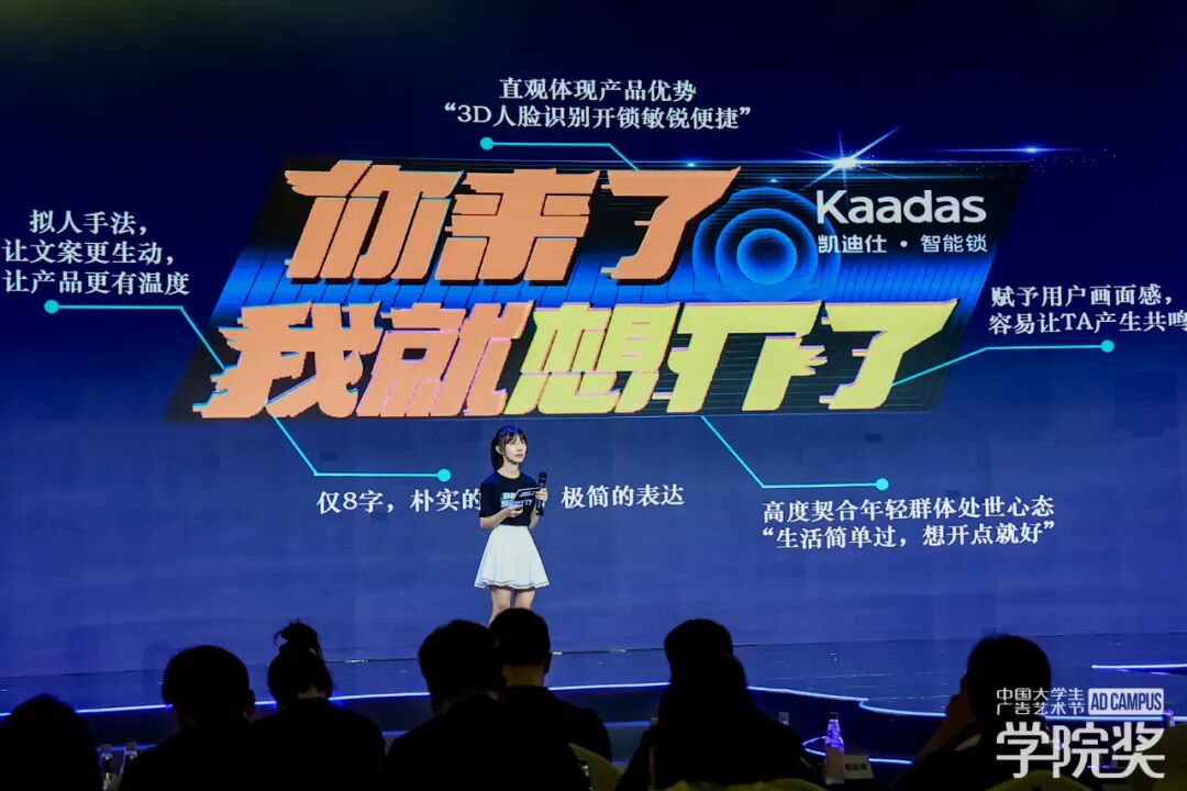 其中,凯迪仕文案金级类作品《你来了,我就想开了》经过层层评审实力突围,一举斩获学院奖2023春季征集大赛最高殊荣——全场大奖。获奖学子现身青春盛典现场参与全场大奖角逐,阐述自己的创作历程。