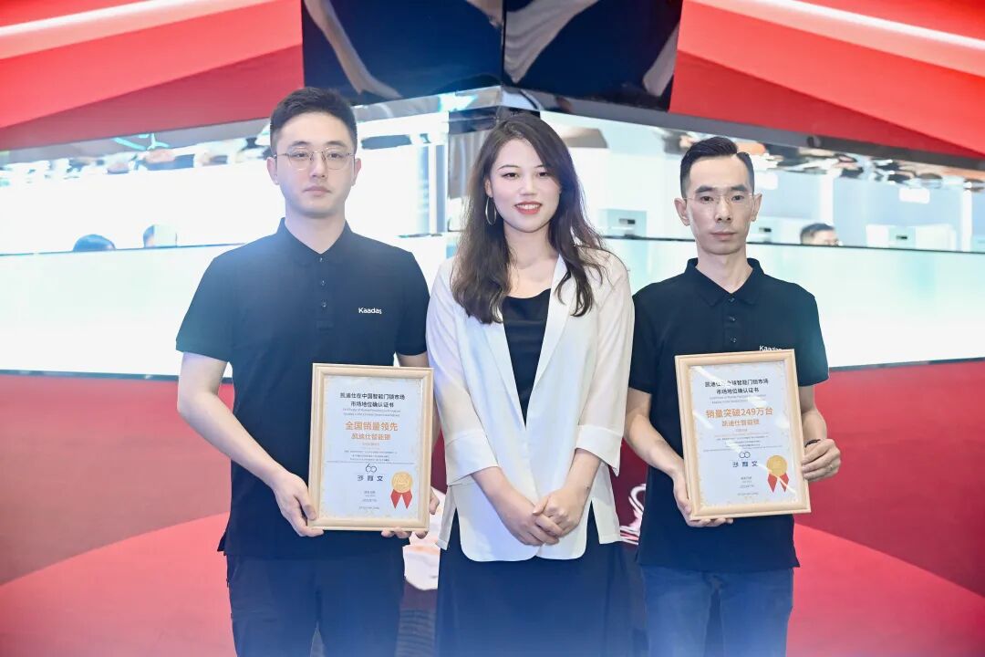 展馆现场,凯迪仕获得了弗若斯特沙利文(Frost & Sullivan,简称“沙利文”)颁发的“凯迪仕智能锁全国销量领先”和“凯迪仕智能锁2022年销量突破249万台”两大行业地位确认证书。