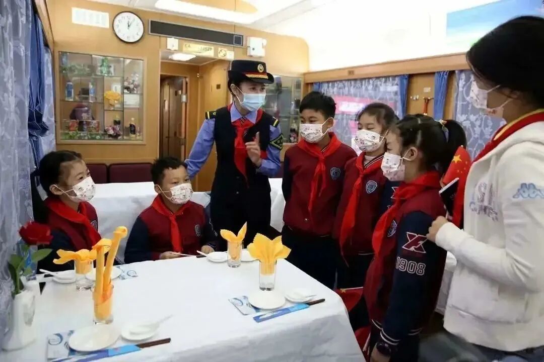 “红领巾号”列车承载着队员们的光荣梦想。列车设有“文化长廊”,悬挂习近平总书记对少年儿童的寄语海报,餐车设有“展示柜”,摆放着各时期各型号的火车模型。