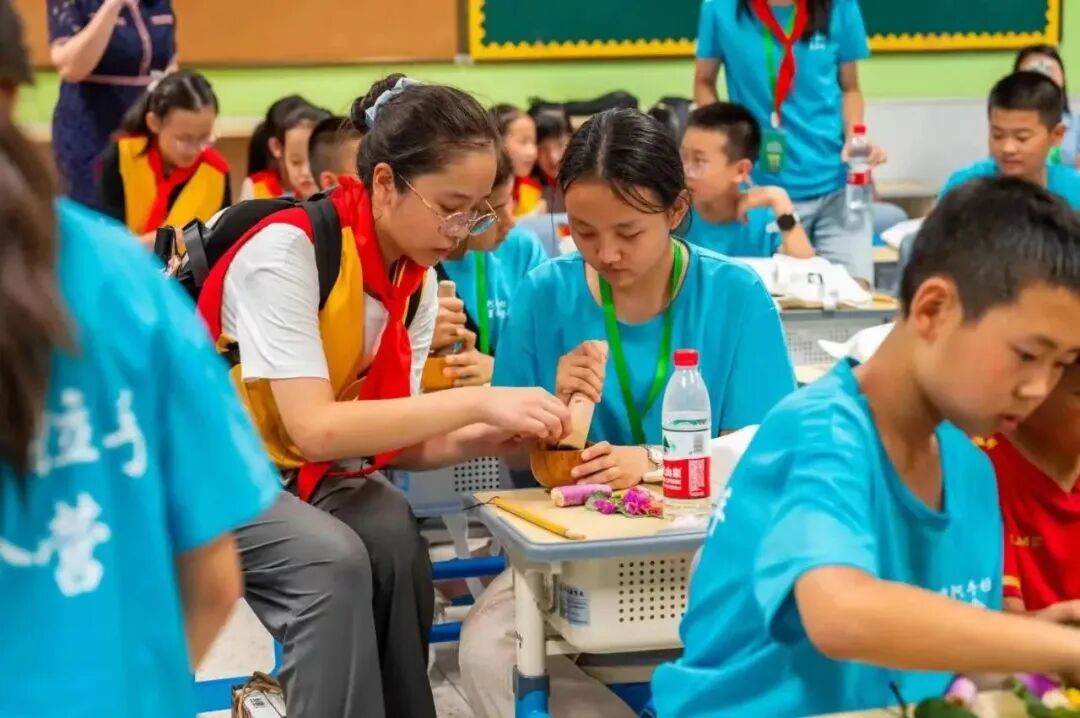 学校向“自然借一抹绿”社团为孩子们带来了传统的手工制作课程,两地的队员们在老师的讲解下认识植物染料以及其制作的方法。通过小心翼翼地“捣”“碾”等一系列工序,队员们合作完成了染料的制作,并将其装入小玻璃瓶中。队员们用制作好的染料,在画纸上创作绘制了各种图样。