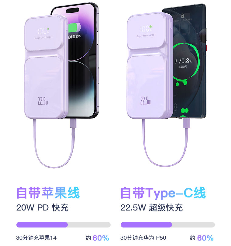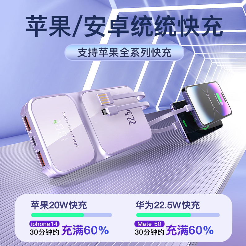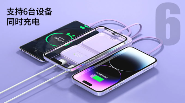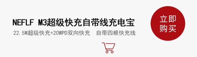 1、22.5W超级快充+20WPD双向快充,30分钟就能充满60%,自带四根快充线,六输出两输入,实现六台设备同时充电2、便携轻巧,拥有20000mAh容量,满冲手机可达3.5次,可携带上飞机!3、颜值超高,获外观专利,LED数显屏幕,随时掌控电量信息,高品质聚合物鲤电芯+防火阻燃材料,使用安全!快充功能决定着给手机充电快慢,如今的手机支持快充已经是标配。当你拿着一个普通充电宝,给手机充满电至少需要2-3个小时,边充边玩的话,充的甚至还没耗的快。而NEFLF M3超级快充自带线充电宝拥有22.5W超级快充+20WPD双向快充!!!这是什么概念呢?就是不管是安卓还是苹果30分钟就能充满60%而一般的充电宝,从没电到充满整整要11到13小时!!!因为这款充电宝的输出功率有(DC5V/2.1A、DC5V/4A),充电速度完全不亚于插座直冲!过了13分钟之后,手机电量就达到了100%,真的很给力了