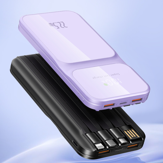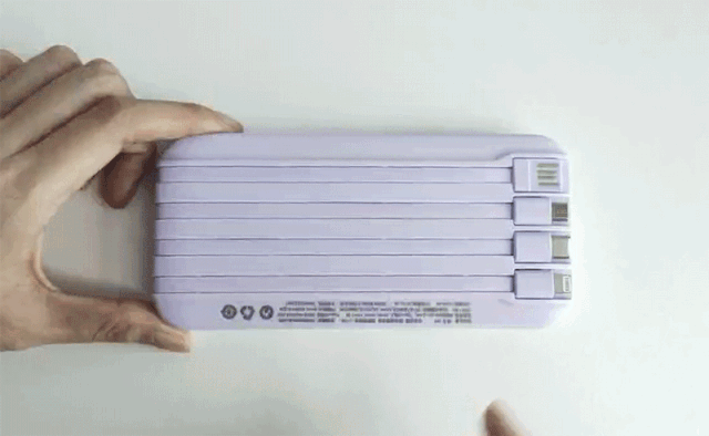 这款充电宝自带苹果Lightning、安卓Type-C数据线、micro和usb四快充线,可以兼容多种设备移动的充电桩,除了手机,其他电子产品也能一同补能,比如充平板(Pad Pro/Air/mini系列等)而且这些充电线都是升级镀锡铜线芯,传导性能强大,拒绝外界干扰,传导快更省时间。设计也很巧妙,180°平拉出线设计充电不顶手机,加上凹槽设计,取线超方便关键是真方便啊,轻轻一撬,即可使用,用完后随意一按就可安装回去,完全不会缠在一起一想到舍弃了一堆又长又多的线,四条线隐形收纳装包里更好带,出行心情都变好了呢