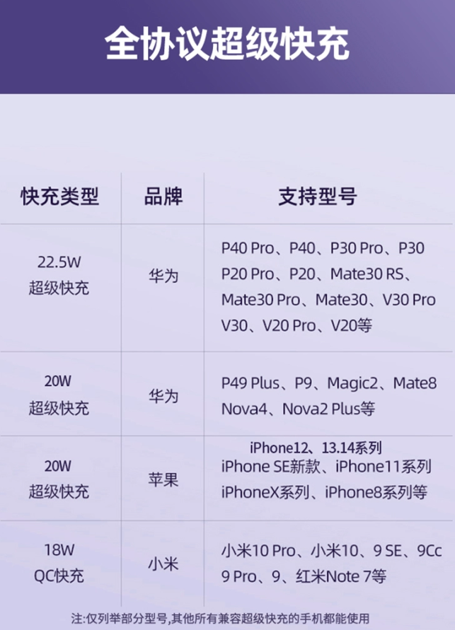 不过这里要提醒一下大家,在购买充电宝的时候一定要看清楚“快充协议”。只有手机、充电宝互相兼容的快充协议才能触发快充模式哦!咱们这款充电宝支持PD、华为高压SCP、FCP、QC、AFC、PE+等主流快充协议,以下手机均支持超级快充。如果你不想每次充电都要在包里翻找数据线的话,那自带数据线的充电宝真的会给到你极大的方便。