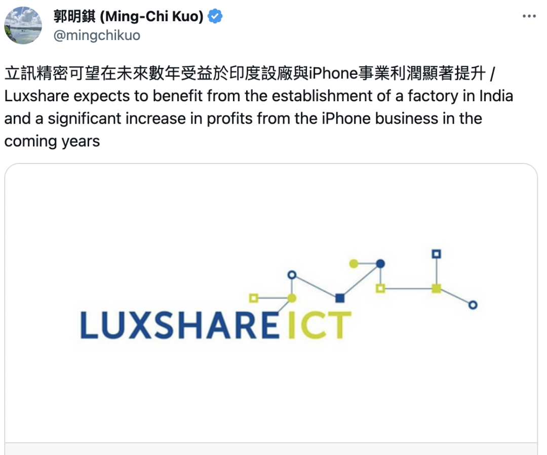 ▲郭明錤称立讯精密将受益于其在印度设厂以及苹果代工