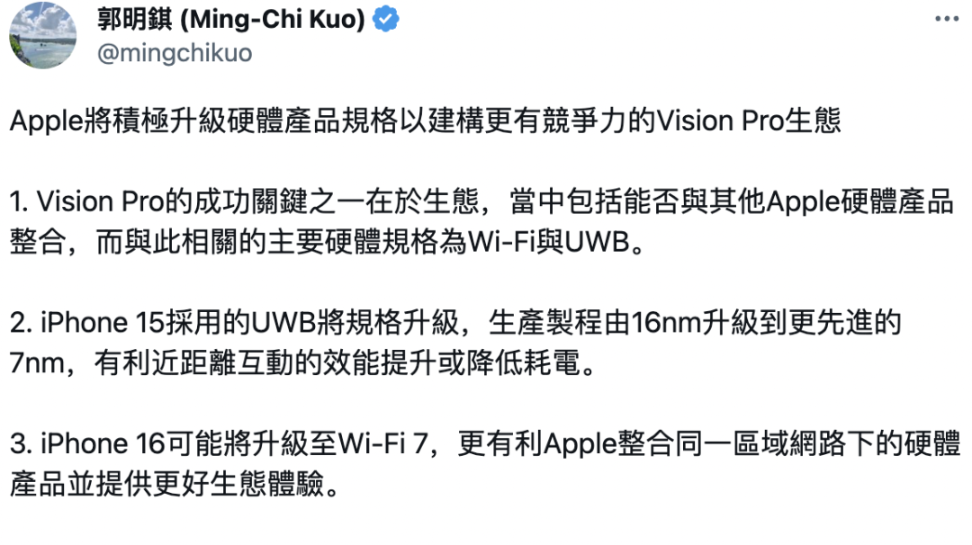 ▲郭明錤关于iPhone 15系列将UWB规格升级至7nm的推文