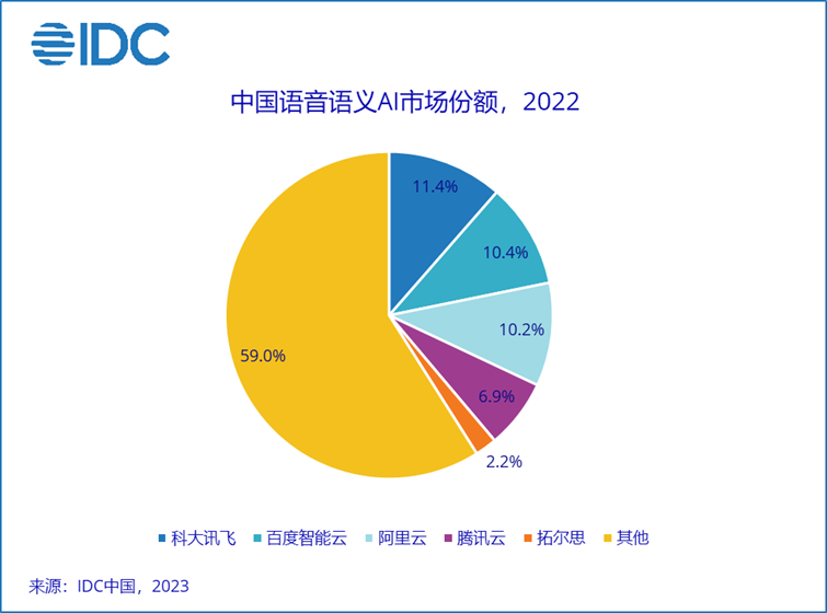在语音语义AI市场,科大讯飞仍旧位于榜首,但百度智能云、阿里云在不断缩小与科大讯飞的距离,中长尾的厂商以分散的应用场景或者解决方案占据了59%的市场份额。