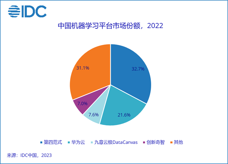 2022年机器学习开发平台市场规模达35.4亿元, 同比下降4.9%,该市场呈现出明显的头部厂商规模化效应,前4名厂商(第四范式、华为云、九章云极、创新奇智)占据68.9%的市场份额。