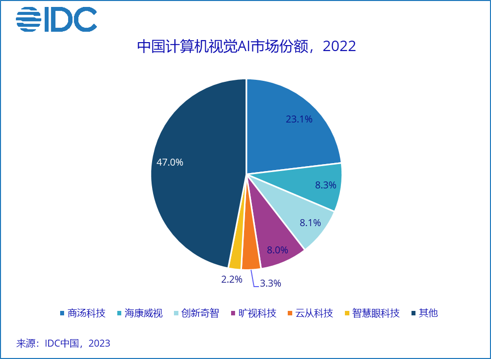 2022年计算机视觉市场规模达123.0亿元,同比缩减19.1%,前五名是商汤科技、海康威视、创新奇智、旷视科技、云从科技、智慧眼科技。