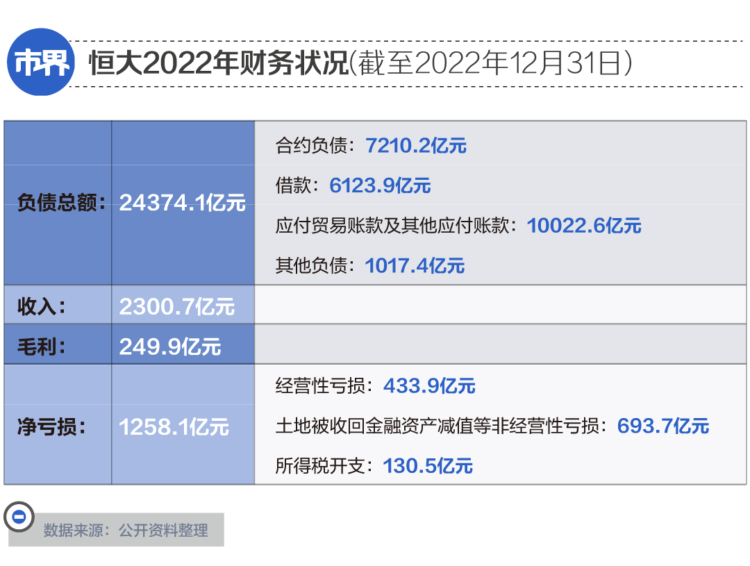 年报显示,在营收方面,恒大2022年收入为2300.7亿元,毛利249.9亿元,毛利率为10.86%,经营性亏损433.9亿元,土地被收回有关的亏损、金融资产减值损失及其他非经营性亏损693.7亿元,所得税开支130.5亿元,净亏损合计1258.1亿元。