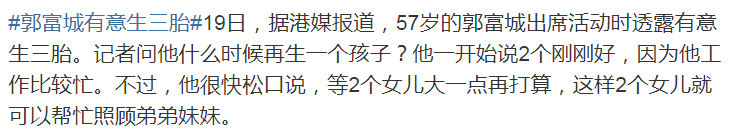 有媒体采访郭富城,问到三胎的事,他松口说想等孩子大一点再打算,不过这种事也是顺其自然,所以并不排斥三胎。估计很多网友对他想要三胎的事不意外,因为无论从孩子数量上还是性别上,他都没到很满意的程度,所以多几个孩子他也养得起,最好呢后面再生是儿子。这种想要儿子的话他婚前也透露过,反正方媛现在年轻也身体好,只要他们能造娃那就造。合法夫妻想生就生了,两口子自己商量着来就行了。
