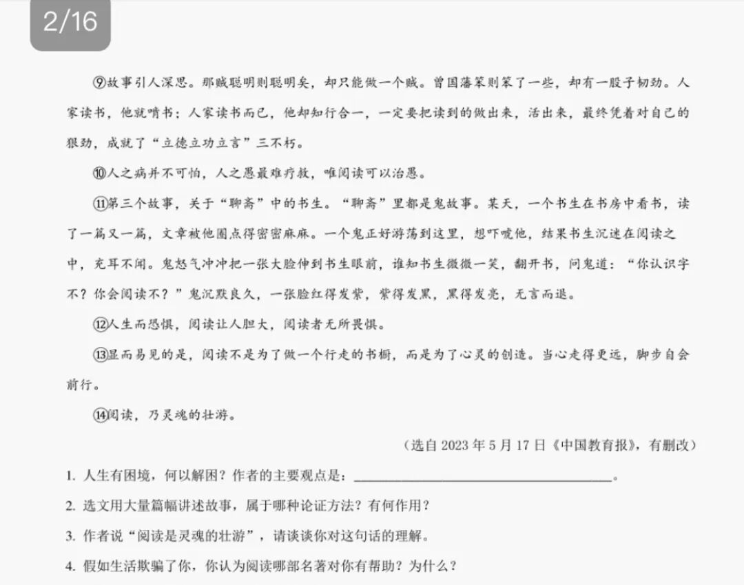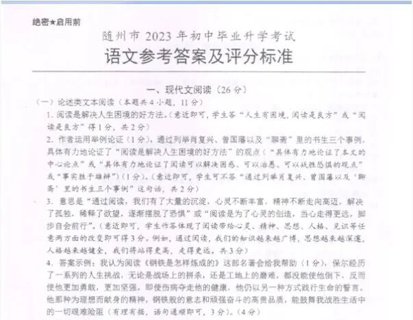 前几天有网友私信我,说这篇文章被用作湖北省某市的中考试题。网友让我做一做,看看得分情况。我这才知道,于是网上找到试题。