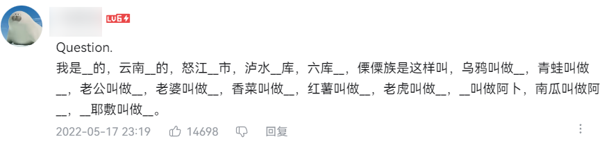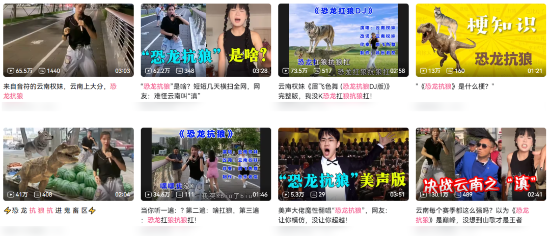 这首歌节奏感极强,歌词洗脑,当年火遍大街小巷,跟《 不如跳舞 》并称两大神曲。但让人摸不着头脑的是,每当熟悉的 BGM 响起,与其配合的不是郑秀文,而是一些神秘词语的吟唱, “ 哦卖 K ” 、 “ 恐龙抗狼 ” 等等,听起来魔性极了。本来觉得没啥,可昨天连同事在公司打游戏时,嘴里也在 “ 恐龙抗狼抗狼抗 ” 。源视频出处是抖音博主@云南权妹,如你所见,她用像哦卖K,恐龙抗狼,布鲁biu布鲁biu 等拟声词把歌曲主旋律唱了出来。虽然听完后,我还是没整明白《 恐龙抗狼 》哪牛了,但上网刷刷,我发现它早以迅雷不及掩耳之势,成了新魔性圣经。原视频的数据就堪称夸张了,点赞是百万计的,转发都有 73 万。。。第一次看到评论区都是跟唱语音条的。前阵子红透半边天的华语乐坛新四大天王,恐怕都没这待遇。。。唱歌本身有门槛,对自己歌声心里没底的人们,为了释放上头之情,拿出了其他才艺。有人就为恐龙抗狼编了土味情话,“ 可惜你不听恐龙抗狼也不懂我 ”。据考据, “ 恐龙抗狼 ” 本是云贵川部分地区流行的拟声词,类似铁桶从台阶上滚下去的声音,其实还有种更普通话的说法: “ 空隆哐啷 ” 。但标准的拟声没意思,恐龙抗狼就很不一样,早已灭绝的生物背上扛了一匹远古的狼在狂奔,怎么想怎么魔幻。先是经典重现,在一声声哦卖 K 中,权妹走向卖瓜老板,结果发现不仅缺斤少两,瓜的质量还不好,于是站上瓜摊舞了起来。权妹先跟练习时长两年半的男星进行了唱跳 PK ,然后登上草根舞台顶流超级女声,被评委拷打后,通过恐龙抗狼肇事逃逸。以往一个整活视频火了,大家都是聚焦片段本身展开二创恶搞。之前在 B 站爆火的华强买瓜、坤舞以及大威天龙都是如此,但在恐龙抗狼的视频下,大家除了玩梗以外,还疯狂点名:我来解释一下,你可以把将省份视为参赛选手,把各省整活视频视为参赛作品,如果某省出了一个特别出圈抽象的视频,那就是为自己家乡上分了,像恐龙抗狼这样的极致作品,足以进入互联网抽象巅峰赛。然后网友一合计,诶,不对啊,别的省都是几年出一个抽象视频。。。实际上,还不止是感叹,有人还直接拷问起去年的云南知识点,乌鸦叫什么?这个知识点的出处,来自去年云南怒江傈僳族小伙蔡金发的一个视频。在动感的节奏中,蔡金发一头飘逸的长发跟着节奏一起抖动,他用 rap 的方式给大家科普了傈僳族方言,青蛙叫作欧巴,老公叫作搓趴, 老婆叫作搓嘛。看妆容是一位甜妹,但恐怕她一开口你就只能愣在当场了。以及自创英文版山歌,教大家学英文的云南小伙赵同学。有人调侃,以前的云南是彩云之南,现在的云南是中国的弗罗里达州( 佛罗里达因盛产各类奇葩新闻出名 ),不养闲人。值得一提的是,虽然调侃云南是「 滇 」峰选手是近几年的事儿,但云南在互联网上的传奇故事,早就有之。如果忘了,可以直接去视频网站上搜一搜,这里世超简单贴贴。比如《 假烟假酒假朋友 》里就这样唱, “ 假烟假酒假朋友,假情假意假温柔,把我哄到你家去,半夜三更赶我走 ” 。《 要你了解哥长短 》里的歌词也是, “ 哪个女人不结婚,哪个女人不怀春 ” 、 “ 要让爱情大发展,我想试试你深浅 ” 。当然啊,虽然歌词乍一听很俗,但如果你一昧地往俗了想,那就说明个人修养和文学造诣还不足够欣赏这些民间山歌艺术。云南山歌虽然名字粗俗,但内容自然奔放,爱得潇洒,本质上通过山歌这一形式鼓励妇女不要被旧道德困住,勇敢离开无爱婚姻,追求幸福,甚至不用怕粉身碎骨,体现了云南人淳朴的价值观。总之,洗脑的旋律,劲爆的歌词,让云南山歌早就引领过互联网潮流。一个更为经典的例子是《 老司机带带我 》,这首歌约于 2004 年到 2006 年间灌录, 2008 年上传网络后,在 2010 年持续爆红。自这首歌后, “ 老司机 ” 、 “ 发车 ” 、 “ 跳车 ” 也都被赋予了新含义。不过吧,随着离谱山歌、云南怒江和恐龙抗狼们陆续出圈,网友们虽然玩得不亦乐乎,很多云南人倒并没有感到什么兴奋和自豪。一位云南老哥在知乎上说道,平时云南在网上没有啥存在感,一上热搜就是恶趣味的,老司机、毒蘑菇、黑导游。本来视频娱乐也没啥,但当你发现云南没有正能量上热搜,都是这种时就变味了,我作为云南人觉得很尴尬。很多人觉得这就是大家在互联网上开个玩笑,但总有一些魔怔人,做出让人困扰的事。但你如果足够关注互联网就会发现,虽然大家都在调侃云南,放眼全国,几乎隔三差五就有一个没啥存在感的小城市,因为一个抽象行为暂时走红。广西的上分视频更离谱,从一开始的睡在田里,到去田里打滚搞得自己一身泥,最后还有人直接把自己当牛跑去耕田了。这些视频是一种表演,是为了博眼球,博流量而产出的,但随着它们的病毒式传播,有些不明就里的人把娱乐性视频当现实来看待了。比如山西晋城有四个主持人,想要宣传当地民间文化,所以自己填词,用方言演唱。但表演浮夸,总是四个人排成一排,用奇怪地姿势边走边唱,很多人觉得不讨喜。因为他们的形象实在不怎么样,这些反倒视频变成攻击晋城人最好的武器了。还有个很搞的,有些人上传云南山歌的时候,会特地打贵州山歌的水印,转移攻击。这些视频或许会给当地人带来困扰,但恐怕它永远无法杜绝。你可以笑它土掉渣,可以认为它不应该流传,但这都不影响它还会继续席卷互联网,就像已发生过 N 次的那样。想想
