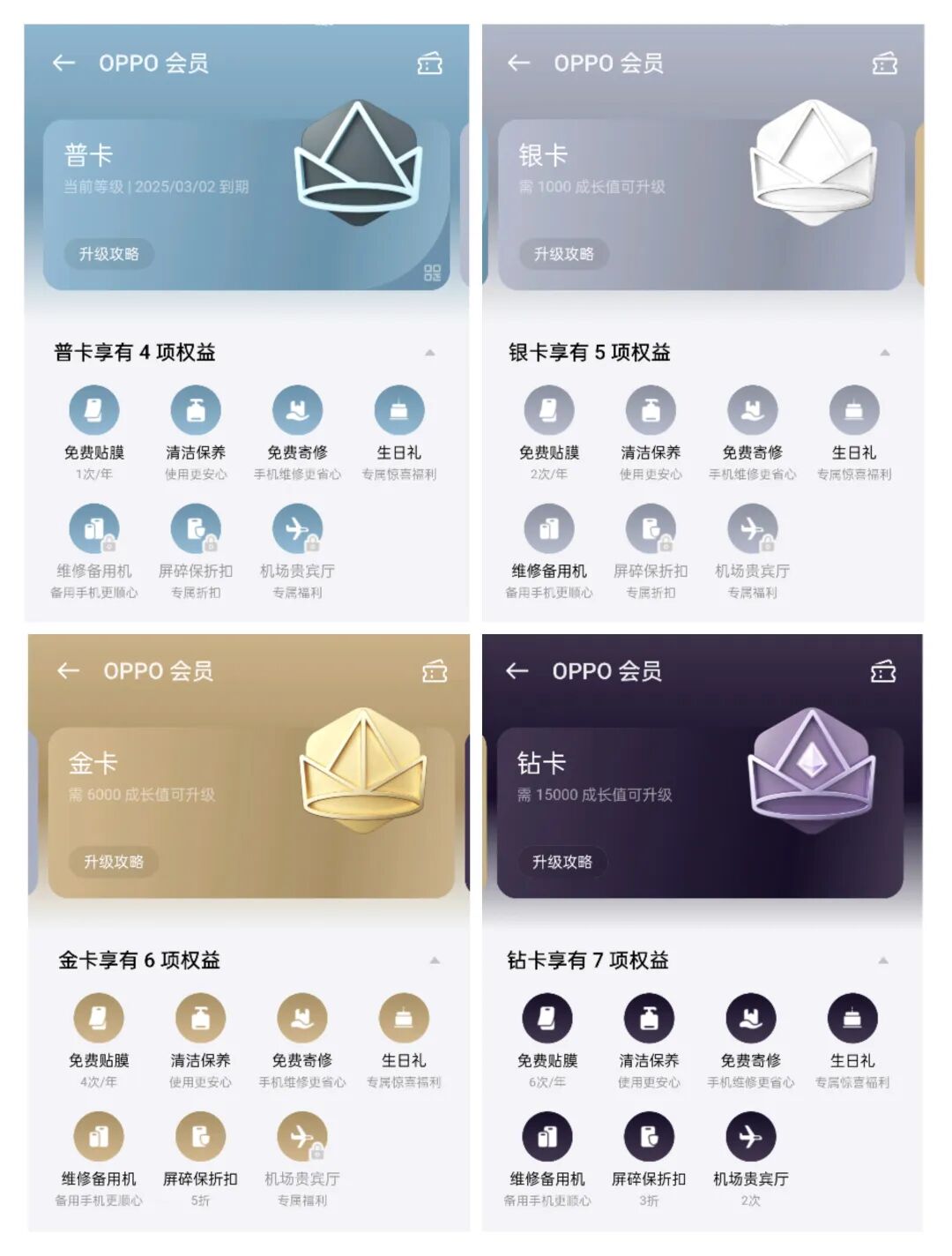 就拿 OPPO 来说,在手机设置里点进账号,你会发现绿厂设置了普卡、银卡、金卡还有钻卡这四个等级,每个等级能享受的权益有所不同: