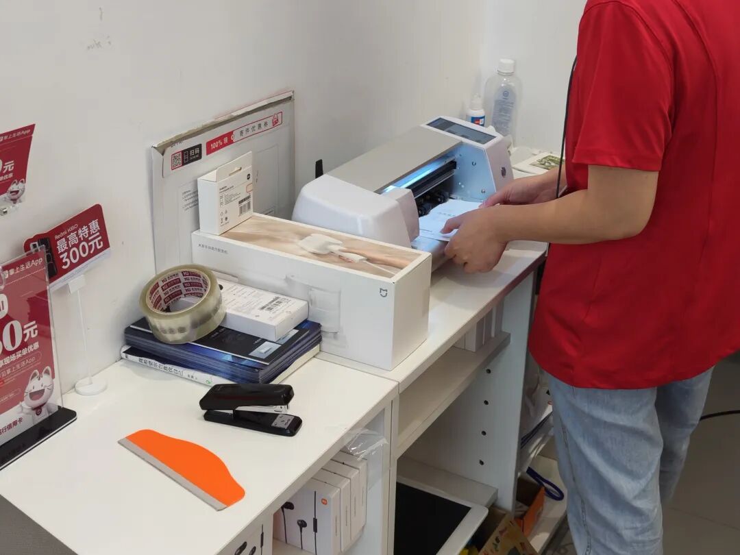 只不过我去的第一家小米专卖店,那边店员告诉我膜已经贴完了,所以就跑去了第二家,好在那家还有,直接用裁膜机裁了张软膜给我手机贴上。