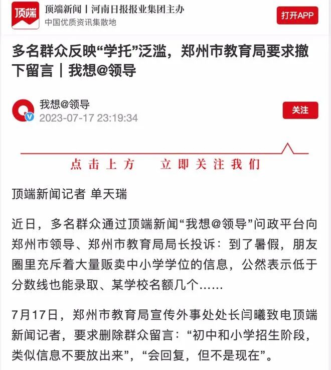 就在刚刚,河南日报报业集团旗下的顶端新闻,发布了《多名群众反映“学托”泛滥,郑州市教育局要求撤下留言》报道,硬刚这位宣传处长。