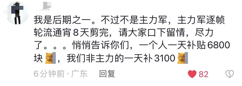 还有网传后期轮流八天剪完,一人一天补贴6800,非主力一天3100。