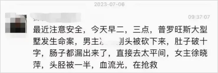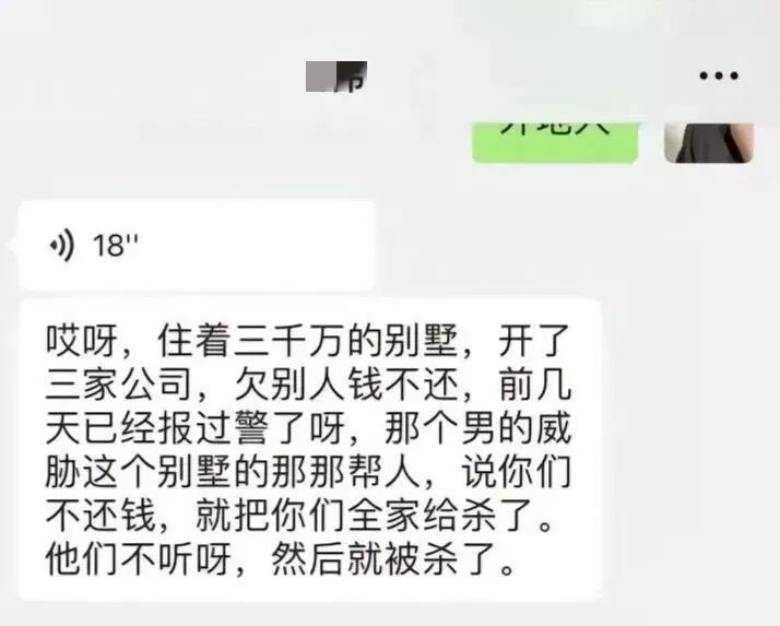然后该微信群业主王先生表示:“案发现场别墅价值三千万,死者夫妻有三家公司,之前死者夫妻在别墅里与凶手赵某,因为欠赵某款项引起冲突,死者还叫来一帮人威胁赵某,然后当时赵某说杀你全家,最终双方报警处理,但是没有调解好,没几天就发生命案了。”