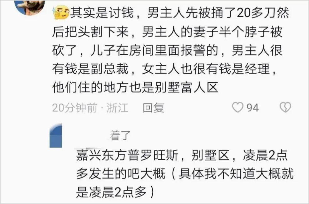 据死者家中监控视频显示,事情发生7月6日凌晨3时许,死者别墅地址为嘉兴市南湖区东栅街道一小区,凶手入室盗窃让户主凌某惊醒,凶手直接致凌某某、徐某某重伤,后报警处理,紧急将凌某与徐某送院治疗,最终医院抢救无效死亡。