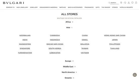 据界面新闻,网友指出的问题并非出现在宝格丽中国大陆官网,而是在宝格丽台湾地区和宝格丽国际官方网站上。点击这些区域性网站左上角的“寻找精品店”,或是“Find a Store”进入,都能找到”所有精品店”或“All Stores”页面。