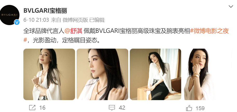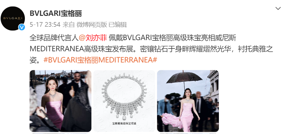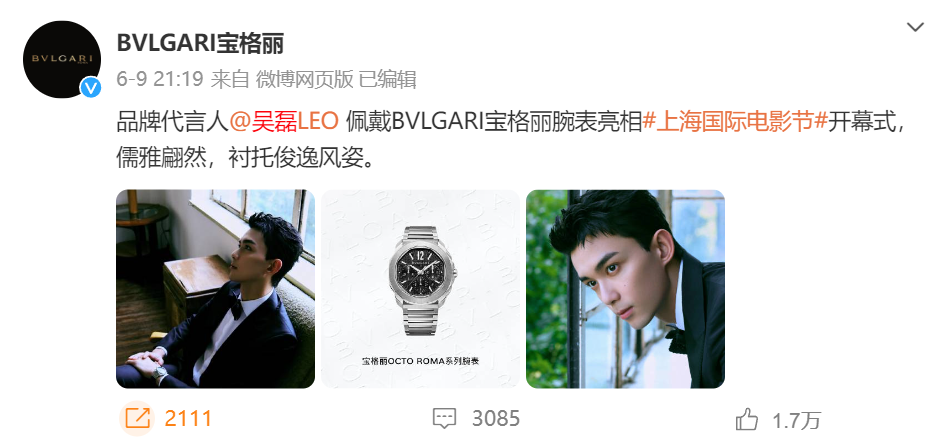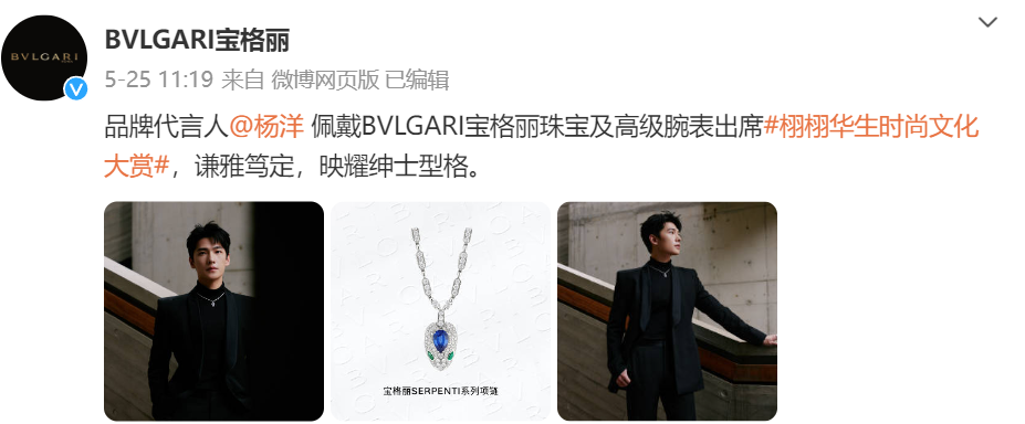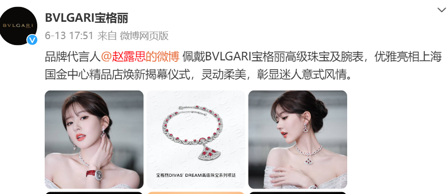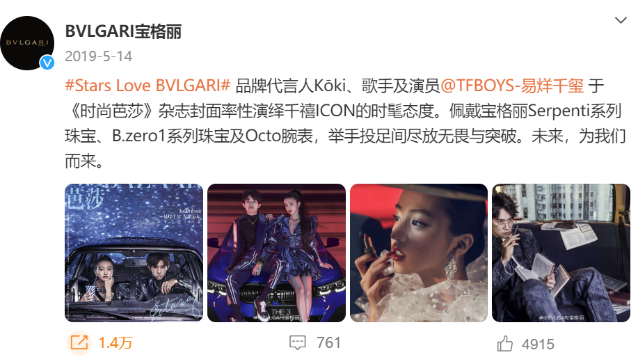 像宝格丽这样的国际品牌对中国市场无疑是重视的,选择多位中国粉丝喜欢的知名明星代言,给予全球品牌代言人、某品类代言人、品牌代言人等不同头衔,合作对象包括刘亦菲、舒淇、杨洋、吴磊、赵露思等。更早之前他们还合作过易烊千玺和蔡徐坤。