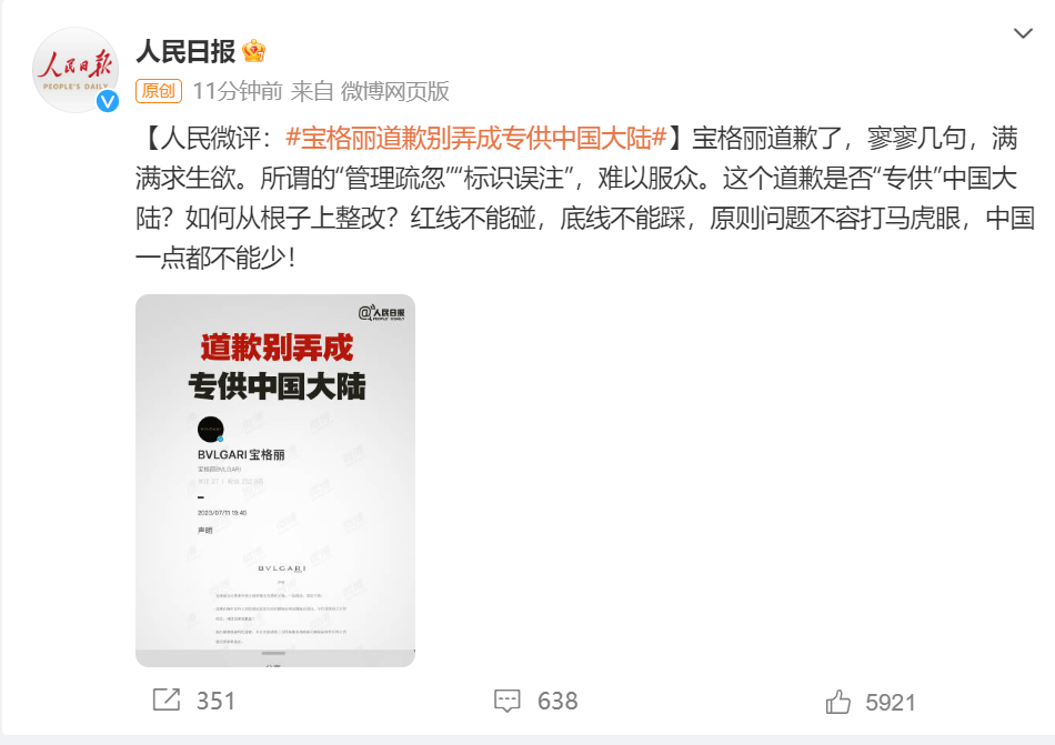 对此,人民日报微博评论称:宝格丽道歉别弄成专供中国大陆!宝格丽道歉了,寥寥几句,满满求生欲。所谓的“管理疏忽”“标识误注”,难以服众。这个道歉是否“专供”中国大陆?如何从根子上整改?红线不能碰,底线不能踩,原则问题不容打马虎眼,中国一点都不能少!