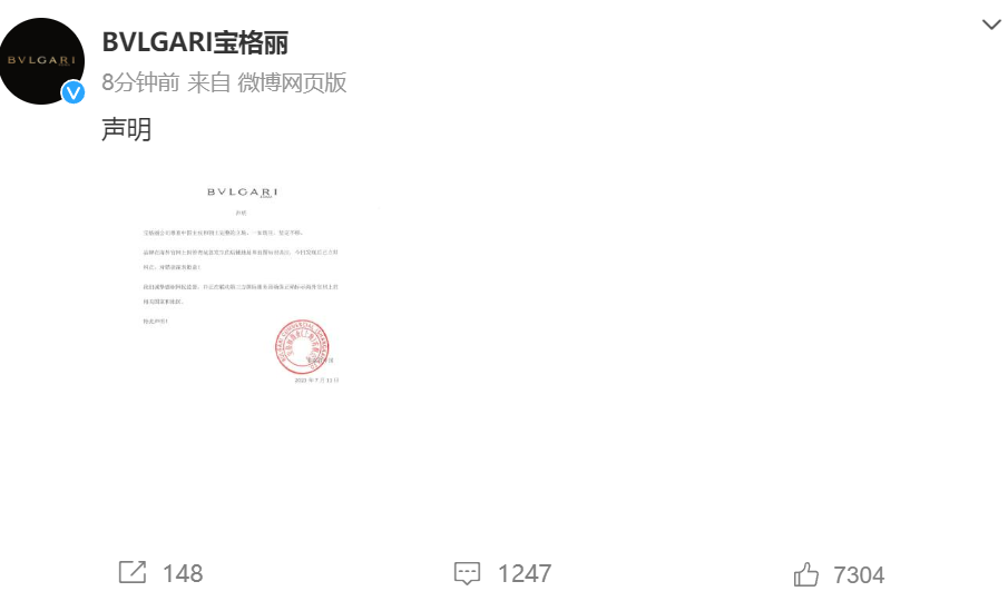 11日晚,宝格丽发表道歉声明称:宝格丽公司尊重中国主权和领土完整的立场,一如既往,坚定不移。品牌在海外官网上因管理疏忽发生的店铺地址标识误注,今日发现后已立即纠正对错误深表歉意!我们诚挚感谢网民监督,并正在联动第三方国际服务商确保正确标示海外官网上的相关国家和地区。