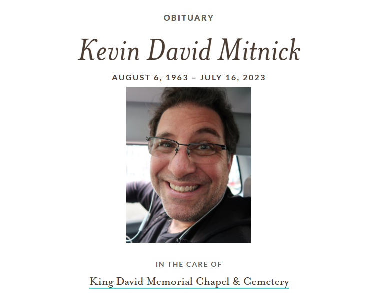 2023年7月16日,Dignity Memorial殡葬网站上的一则讣告宣告了凯文·米特尼克的离世(死于胰腺癌,享年59岁)。