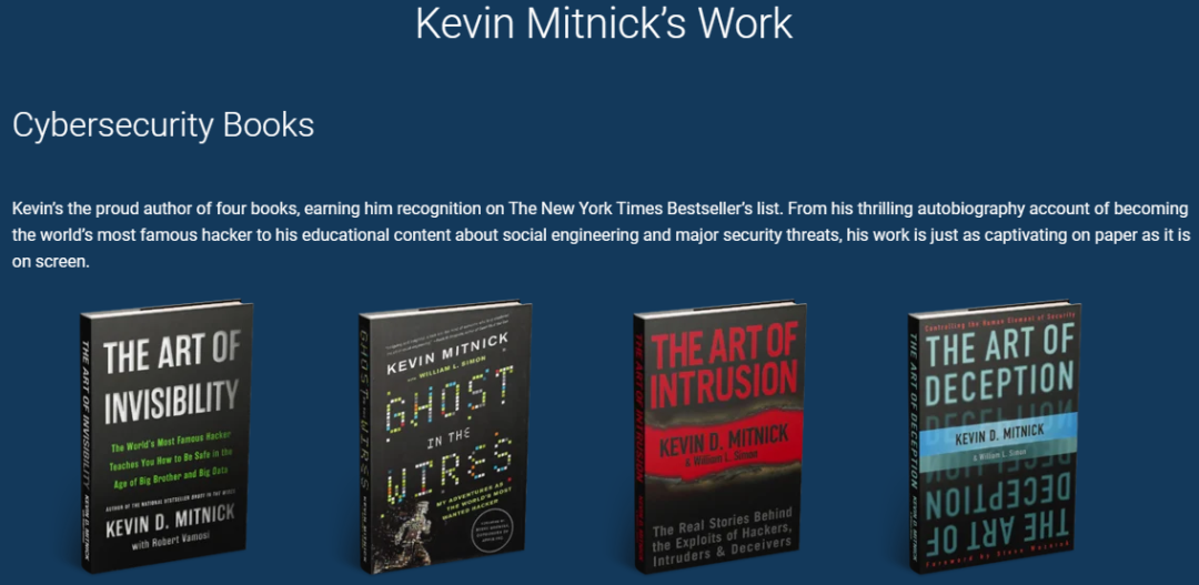 而这段刑期的结束,也意味其备受尊敬的白帽黑客职业生涯的开始。2000年,凯文·米特尼克出狱后,创立了计算机安全咨询公司Mitnick Security。他如今是财富五百强公司和政府机构的安全顾问,旗下拥有一支实力强劲的渗透测试团队。作为社会工程学的创始人之一,他撰写的《欺骗的艺术》《入侵的艺术》《线上幽灵》《隐形的艺术》等著作,是全球无数黑客的启蒙书。他利用自己的亲身经历及毕生所学,从攻击方的角度向人们讲述该如何实施有效的保护措施。