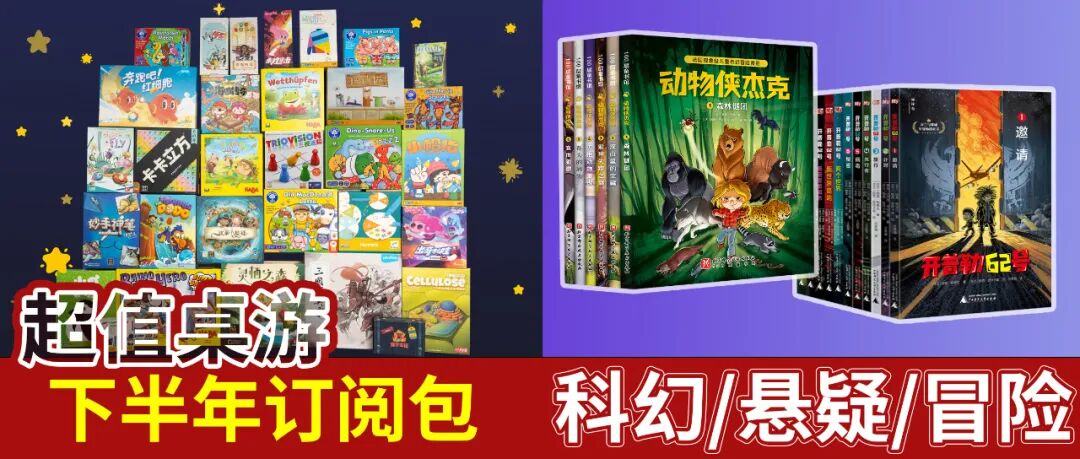 本周的团购又来到了这个每年最激动人心的桌游推荐、团购活动了,无论是从内容的丰富,专业,还是从价格的优惠程度,都是如此。这次我们精选出2023下半年的桌游订阅包,并且根据不同年龄阶段所适合的桌游要求,将产品分为4个阶段。从刚开始接触桌游的2-3岁宝宝,到成年人,都有适合自己的产品。从大家熟悉的国际品牌HABA,Djeco,blue orange,到早米、YAOFISH等国内品牌,其中不乏还包括获得大奖的知名作品。而桌游的类型也覆盖各种模式,从低龄宝宝的动作、认知,到适合高阶桌游玩家的工人放置、手牌管理等等。相信能让不同年龄段的桌游玩家享受到全方位的桌游乐趣。而今天的第二篇文章则是给大家介绍两套很适合在暑假让小朋友提升阅读兴趣的图书,第一套是法国奇幻冒险漫画《动物侠杰克》。另外一套则是图文都非常精彩的科幻小说,阅读感受和视觉冲击力都相当丰富的《开普勒62号》。今年这个超长的暑假中,很适合看看文字量稍微多一些的书籍,根据不同孩子的识字水平和阅读能力,可以选择漫画、桥梁书、儿童文学、经典名著等等。特别是对于小学中高年级的孩子,阅读能力的培养越来越重要了,在时间充裕的假期,尤其适合阅读文学作品。因此,我们这次会给孩子们推荐两套适合在假期读的新书,一套漫画一套科幻文学。《动物侠杰克》的主人公自然是一个叫杰克的男孩。但是他和一般的小朋友不一样,原本是一个拥有变身能力的精灵。因此,当他作为人类的孩子时不会说话,但是他实现了好多孩子的“梦想”——变成各种各样的动物,在逆境中灵活运用动物不同的特征和习性解决难题,完成冒险。![]()