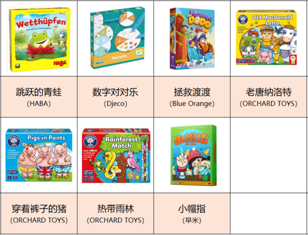 - 通过桌游帮助这个阶段的小朋友提升重要的相关能力,比如寻找规律,手眼配合、简单的规划、精细操作等等;