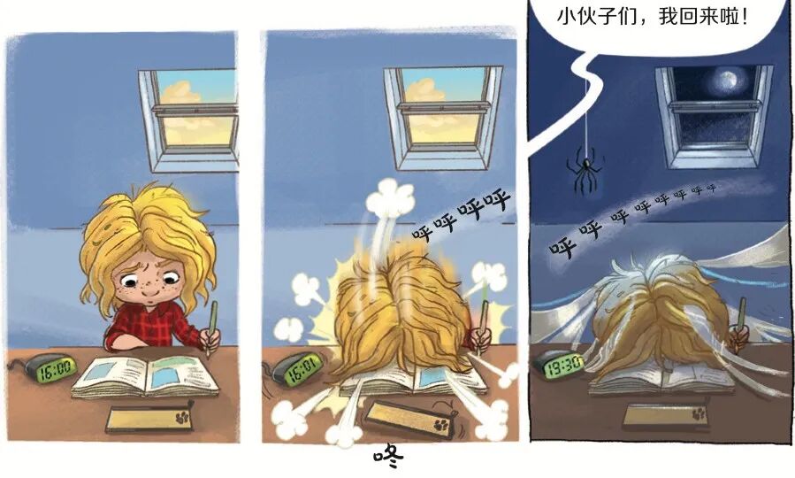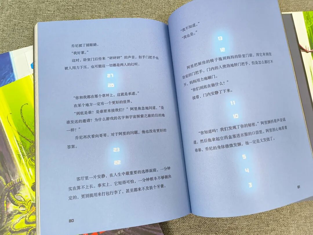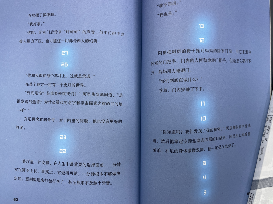 比如:当阿里和乔尼猜到妈妈已经被改造后,想要从母亲身边逃离时,书中的倒计时插画横跨数页,配合兄弟之间的对话文字,紧张氛围陡升。