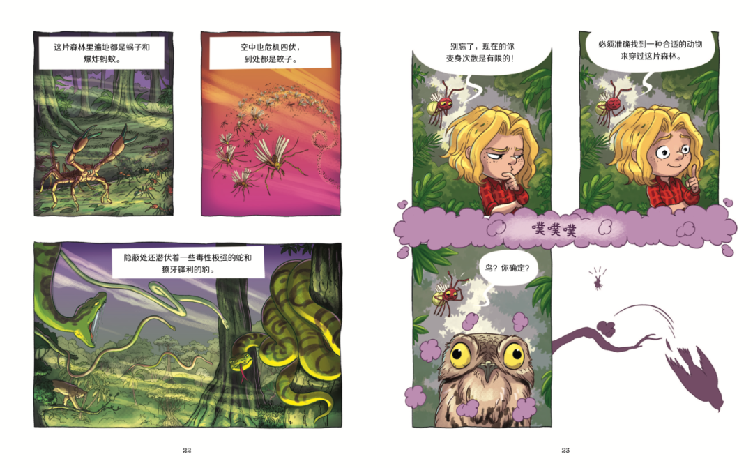 书中通过杰克的变身,一共展现了100多种动物的特性。当孩子自己阅读时,估计都会幻想在那种情况下,自己会变成什么动物才能渡过难关。