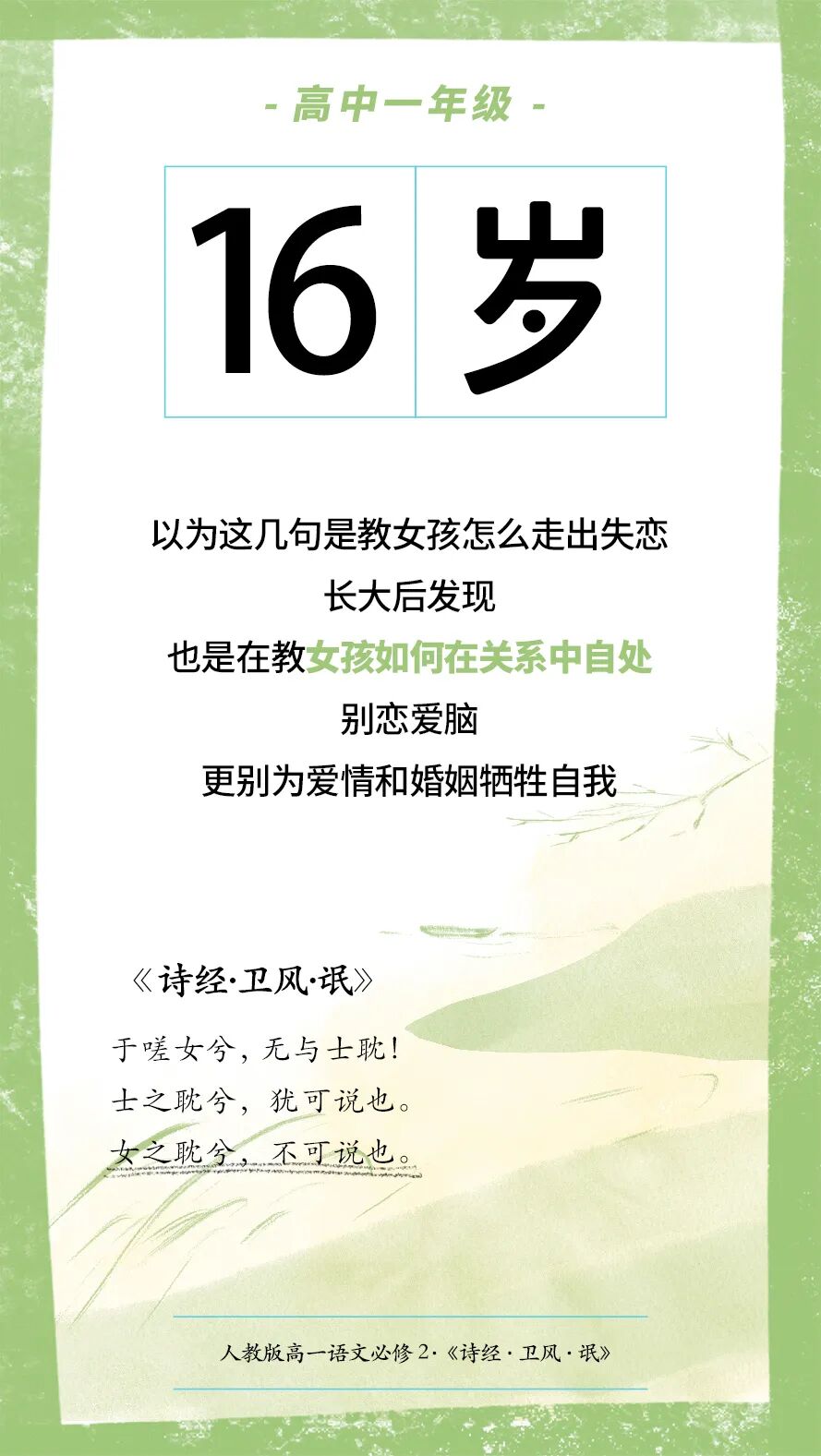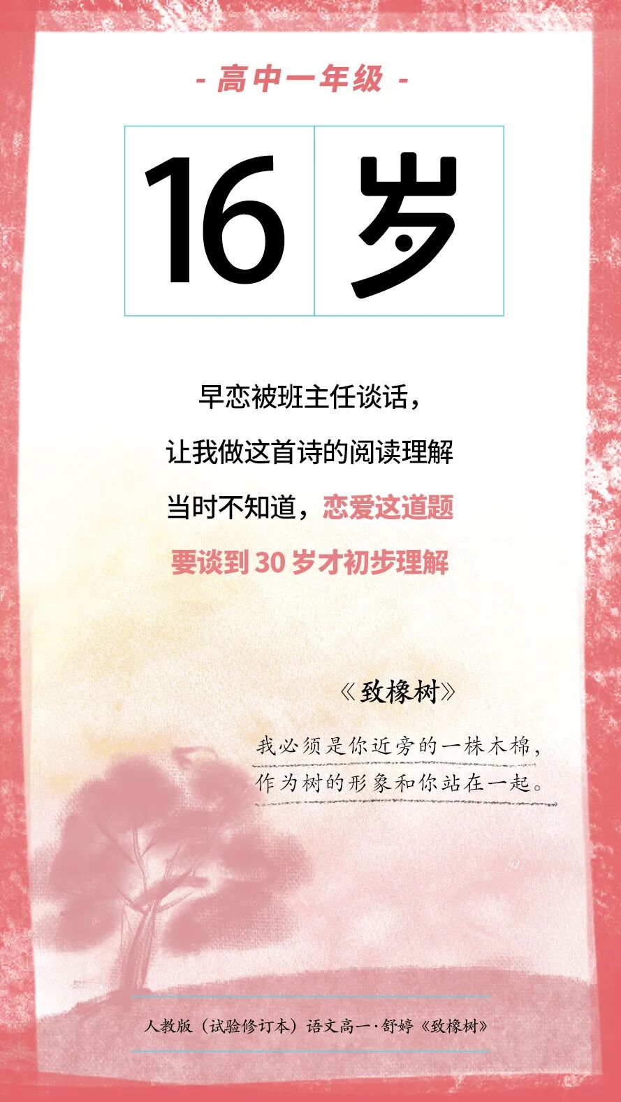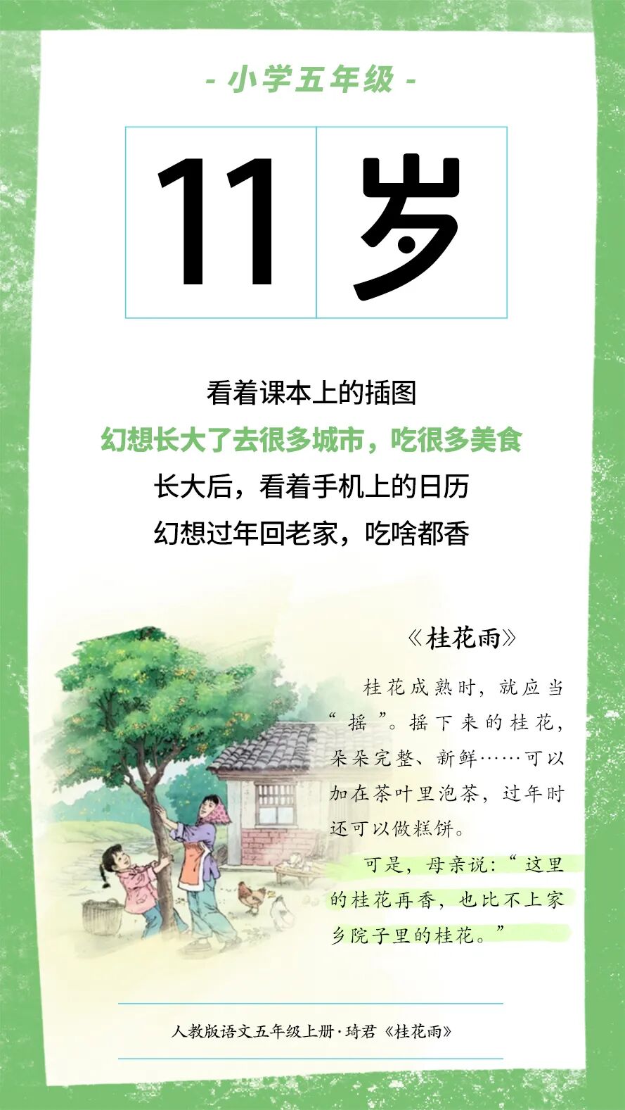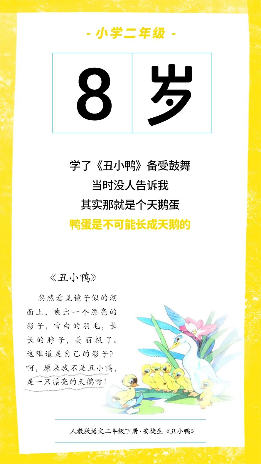 我们怀念小时候什么都不太懂的日子,但也慢慢学会面对“长大后终于懂了”的日子。19 岁,没变成白天鹅,养了一只宠物鸭:鸭鸭这么可爱,鸭鸭做自己就好。23 岁,一起入职的新同事是江苏高邮人,端午节送了她一盒高邮咸鸭蛋,办公室饭搭子 get。29 岁,辞职了,结束无止境加班赶进度、下班赶最后一班地铁的生活。终于不用再和时间赛跑了。30 岁,每天都争取早一点下班,因为“天空不等待那些爱好它的孩子”。33 岁,老公劝我换个轻松的工作,他养我,我给他背了遍舒婷的《致橡树》。35 岁,失去了当年一起翻墙打游戏的张怀民,但认识了等娃睡熟后一起喝酒聊天的张怀民。40 岁,督促儿子全文背诵《滕王阁序》,这样去滕王阁可以免票。两全其美~52 岁,家里老人走了。重读了一遍《秋天的怀念》,是它提醒我,趁老人家身体好时,陪他去了很多地方。65 岁,退休啦。回到乡下老家,开启《归园田居》式的养老生活:“久在樊笼里,复得返自然。”70 岁,25000 多个日子已经从我手中溜去,就像朱自清写的那样,没有声音,也没有影子。平凡一生也经历过许多的事,却都像小石头一个个丢进湖里,一点波纹之后什么都没了。但没关系,我见过波光了……——意识到失去的无可挽回,然后用力握紧手心抓住那些重要的、珍贵的人和事,这是后来语文课本教会我们的事。