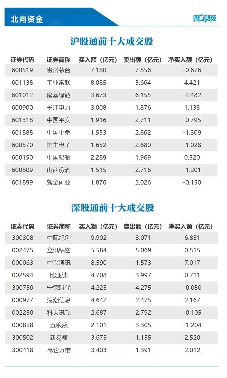 7月20日,北向资金午后分歧加大,全天净买入3.47亿元,一度净买入近25亿元;其中沪股通尾盘离场痕迹明显,日内净卖出10.84亿元,深股通净买入14.31亿元。前十大成交股中,净买入额居前三的是中兴通讯、中际旭创、工业富联;净卖出额居前三的是隆基绿能、中国中免、恒生电子。